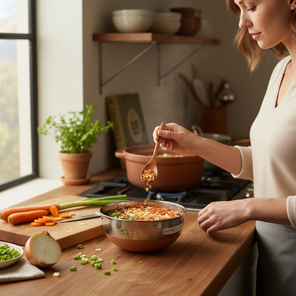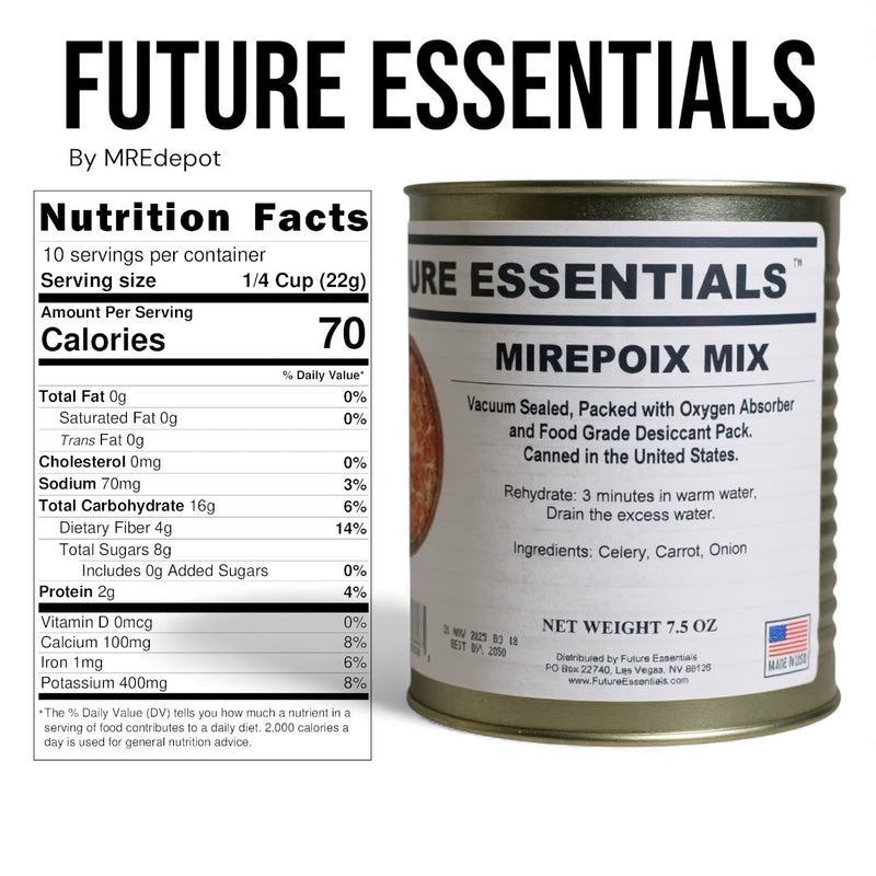 Future Essentials Dehydrated Mirepoix Mix (also known as Soffritto) is a combination of chopped dried carrots, celery, and onions. When re-hydrated with water, this mix of vegetables will maintain the texture and shape of fresh celery, carrot, and onion, with no shrinking or shriveling. This mixture can also be added to soups or stews without rehydration!