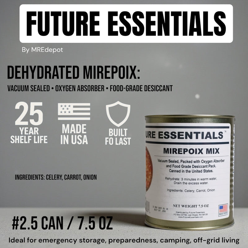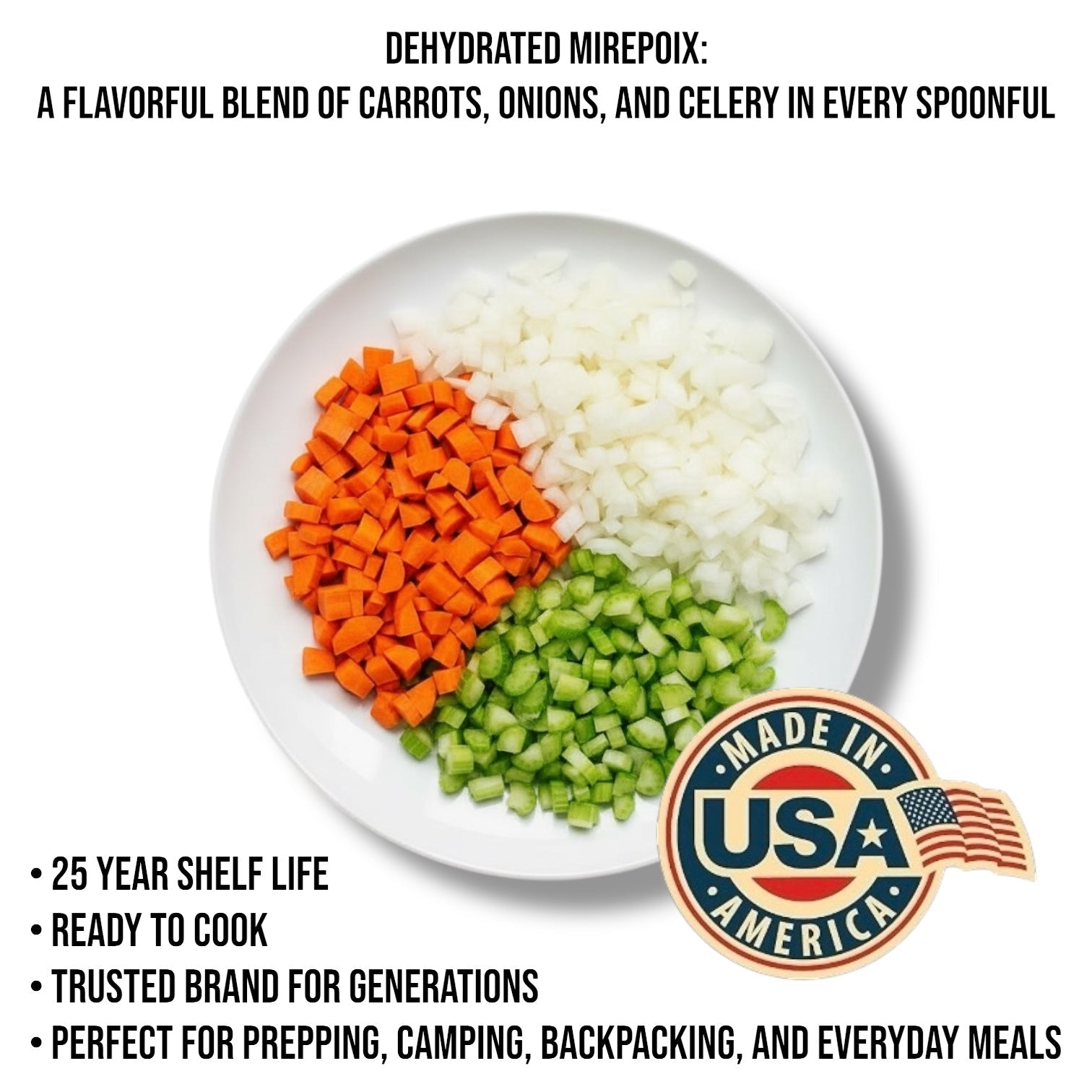 This Future Essentials Dehydrated Mirepoix Mix is an amazing addition to your food storage. Some great dishes to include it in would be stocks, sauces, soups, rice, omelets, and other foods. Once sauteed, this mix can be added to any savory foods.