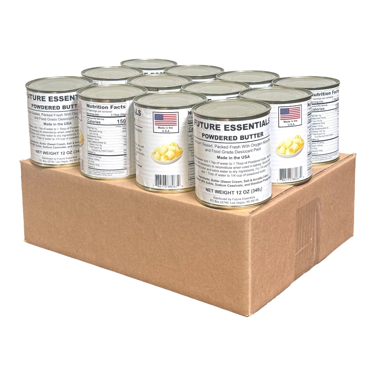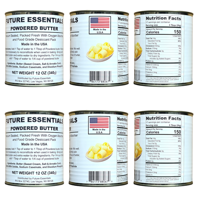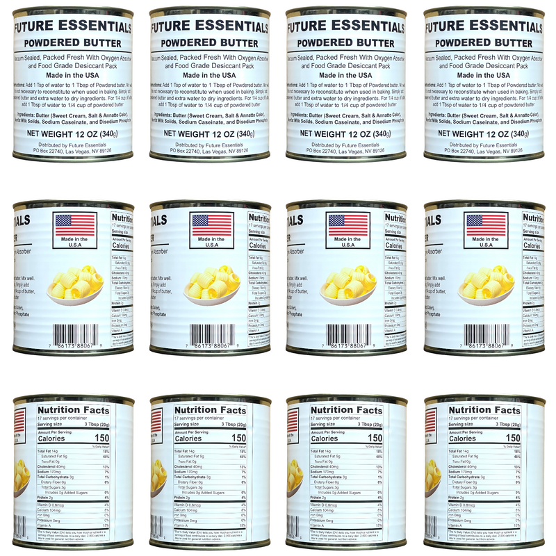 Future Essentials Powdered Butter is completely shelf stable without refrigeration. This fresh, sweet, creamy butter has a full, rich flavor. There are 17 servings per can. Each serving is 3 tablespoons.