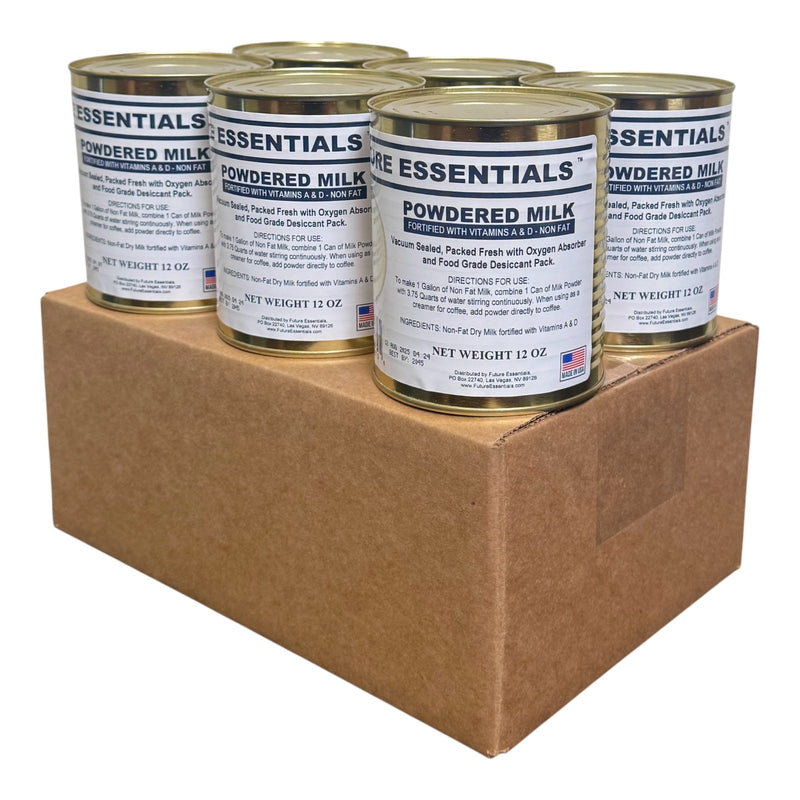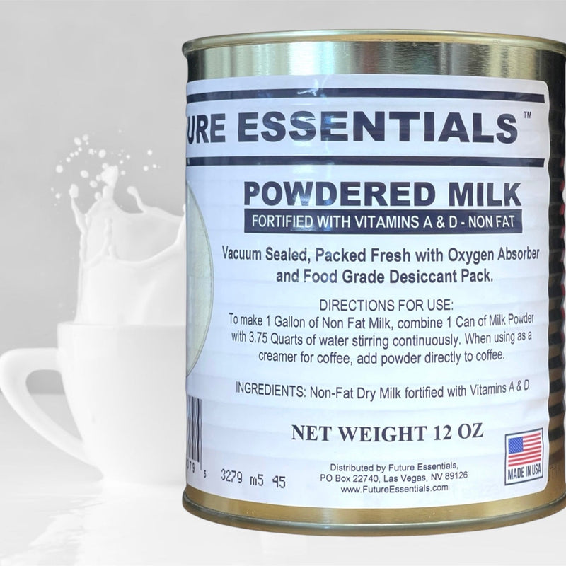 Storage: Future Essentials Non Fat Powdered Milk may be stored in original sealed, oxygen-free cans for up to 20 years. All MREdepot family preparedness products are dry packed using oxygen absorbing packets which have been found safe and effective in eliminating oxygen in a sealed #2.5 Can, providing ideal conditions for long term storage.