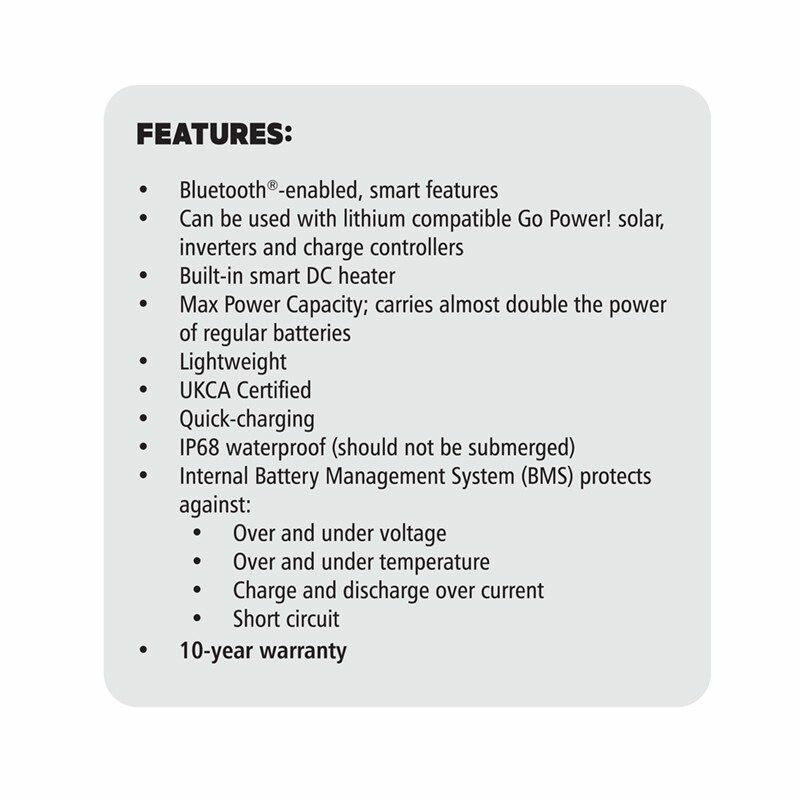 - Can be used with lithium compatible Go Power! solar, inverters and charge controllers