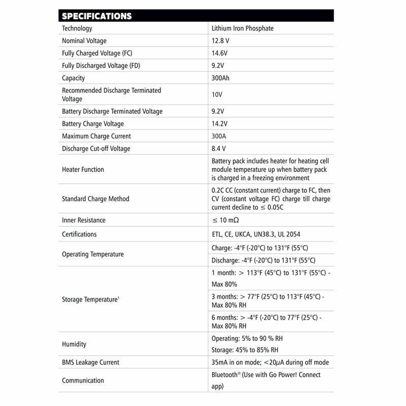 Go Power! 12V 300Ah LifePO4 Lithium Battery (GP-ADV-LiFePO4-300) Specifications: