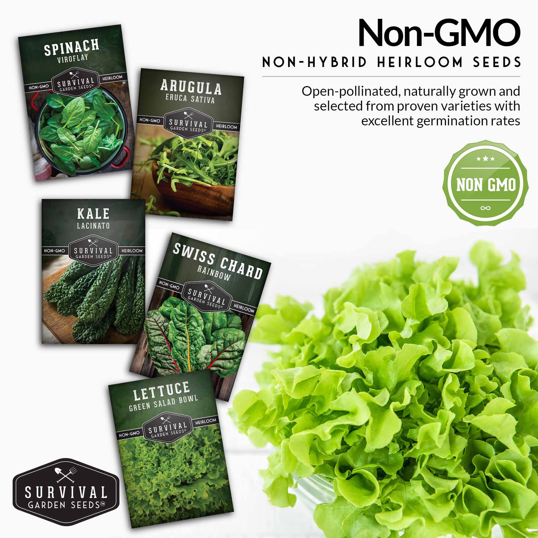 - Healthy & Tasty - Green leafy plants are superfoods packed with flavor and nutrition and essentials for survival gardening. Keep your family well-fed and healthy with this mix of Rainbow Swiss Chard, Lacinato Kale, Green Salad Bowl Lettuce, Viroflay Spinach, and Arugula.