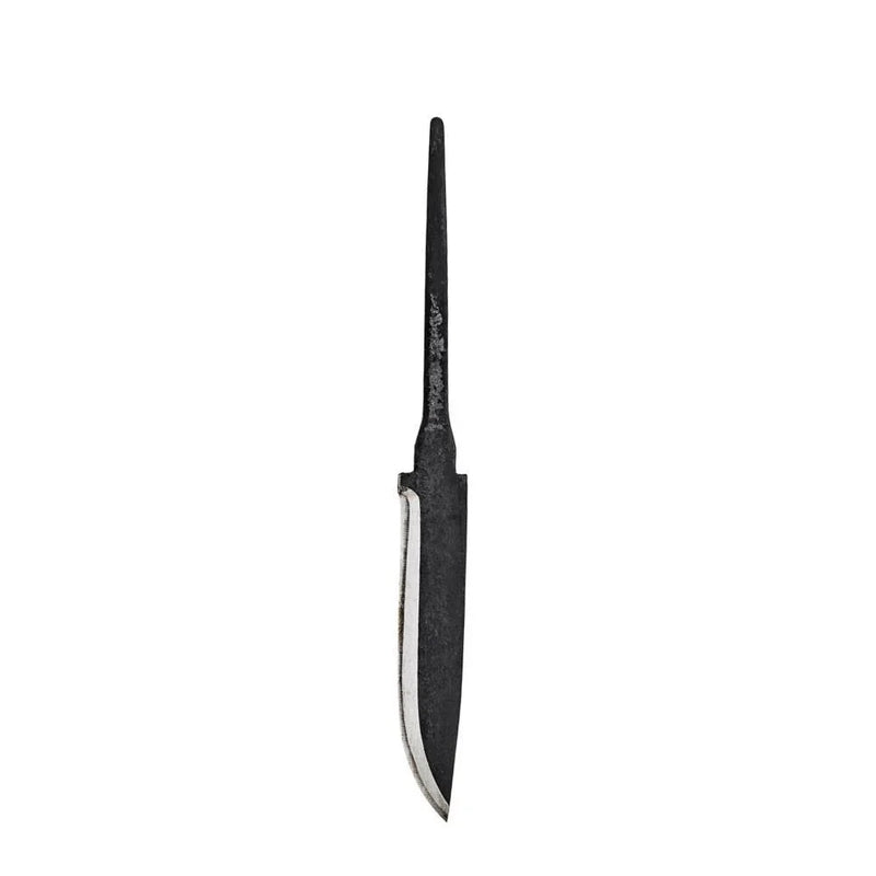 HB-96; the laminated carbon blade is again about 4 3/8" (114 mm) long and 7/8" (22 mm) wide. It's about .147" thick, and comes with the black of the heat treat left on the sides for a rustic look. This is the blade used with the current version of the Viking. The base of the tang is squared off and could be used with the same bolsters as the Lauri carving blades.