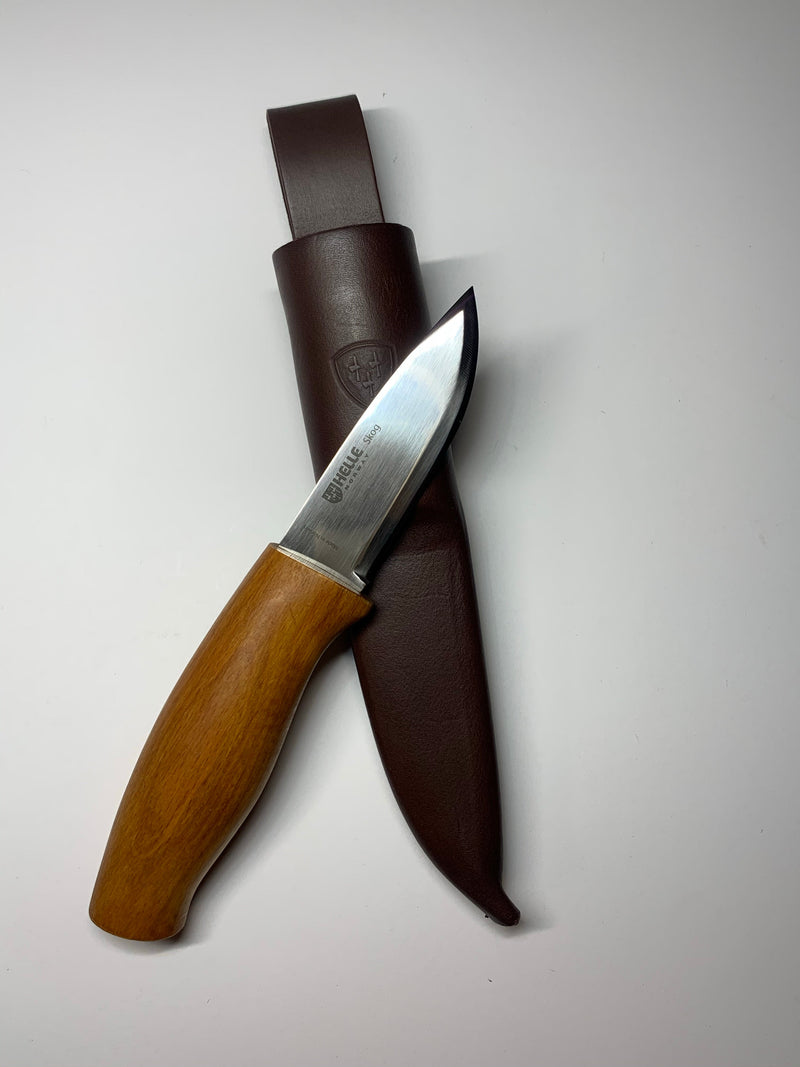 The Helle Skog is named after the Scandinavian word for forest and was developed for evenings by the campfire. This is considered a carving knife but is much more robust than the typical carving knives making it great for many tasks and chores. I would feel more than comfortable using this knife for my every day carry. The triple laminated stainless blade is short enough for complete control. The beechwood handle offers a comfortable grip for long sessions. This knife comes with a genuine leather sheath as pictured.