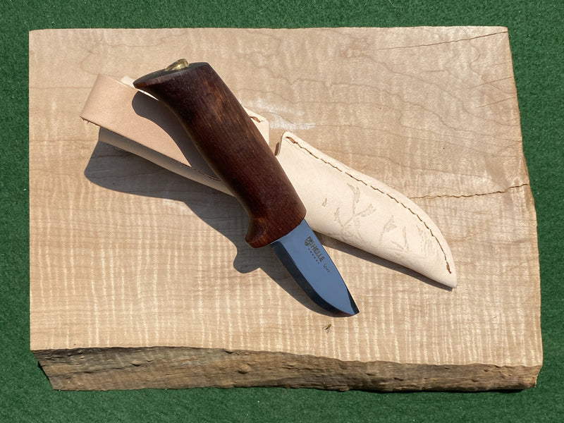 The Helle Spire embodies all the classic features of a full-size knife in a small package. Spire means "to Sprout" in Norwegian. The colored dark brown birch handle is made to fit a four finger grip for smaller hands. The handle also features a nice guard to protect fingers of new carvers and whittlers.