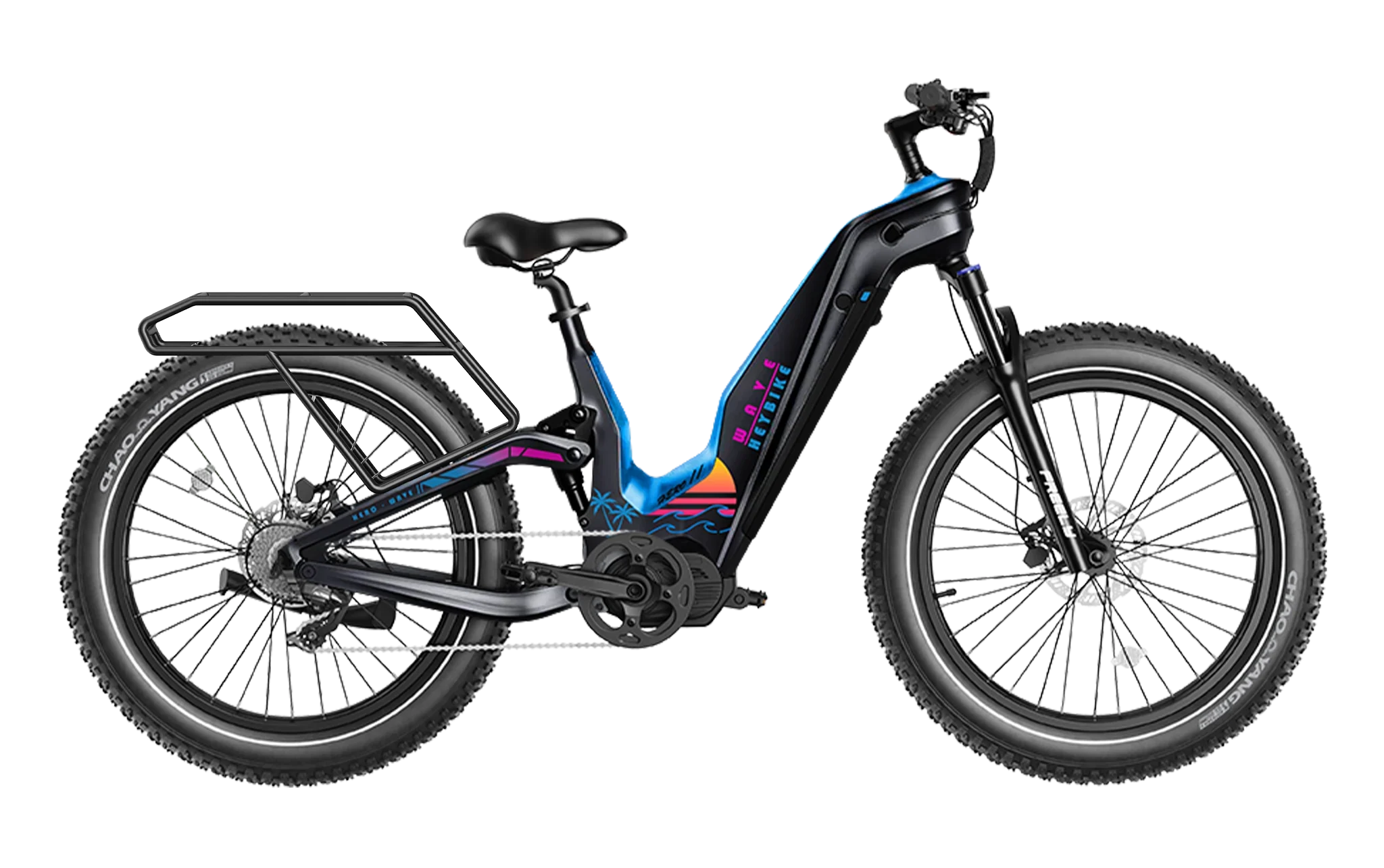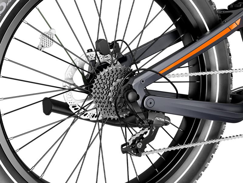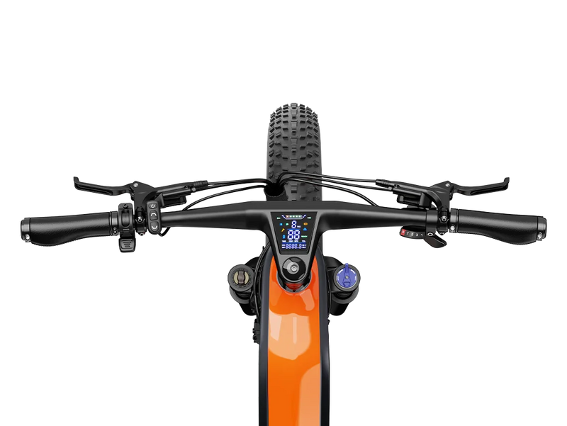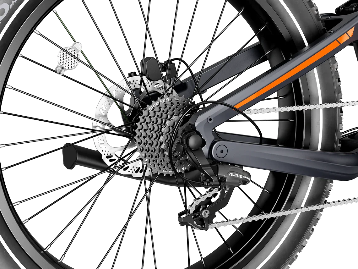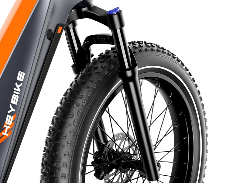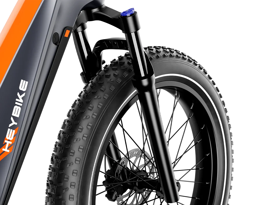 A Horst-link rear suspension paired with a hydraulic front fork delivers superior comfort over rugged terrain. The 26″ × 4.0″ fat tires maintain grip and stability across sand, snow, gravel, or uneven trails. -