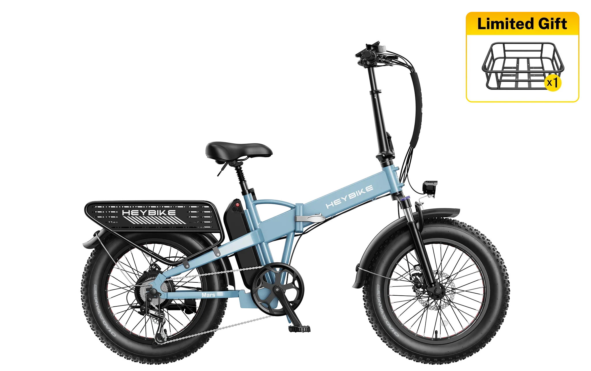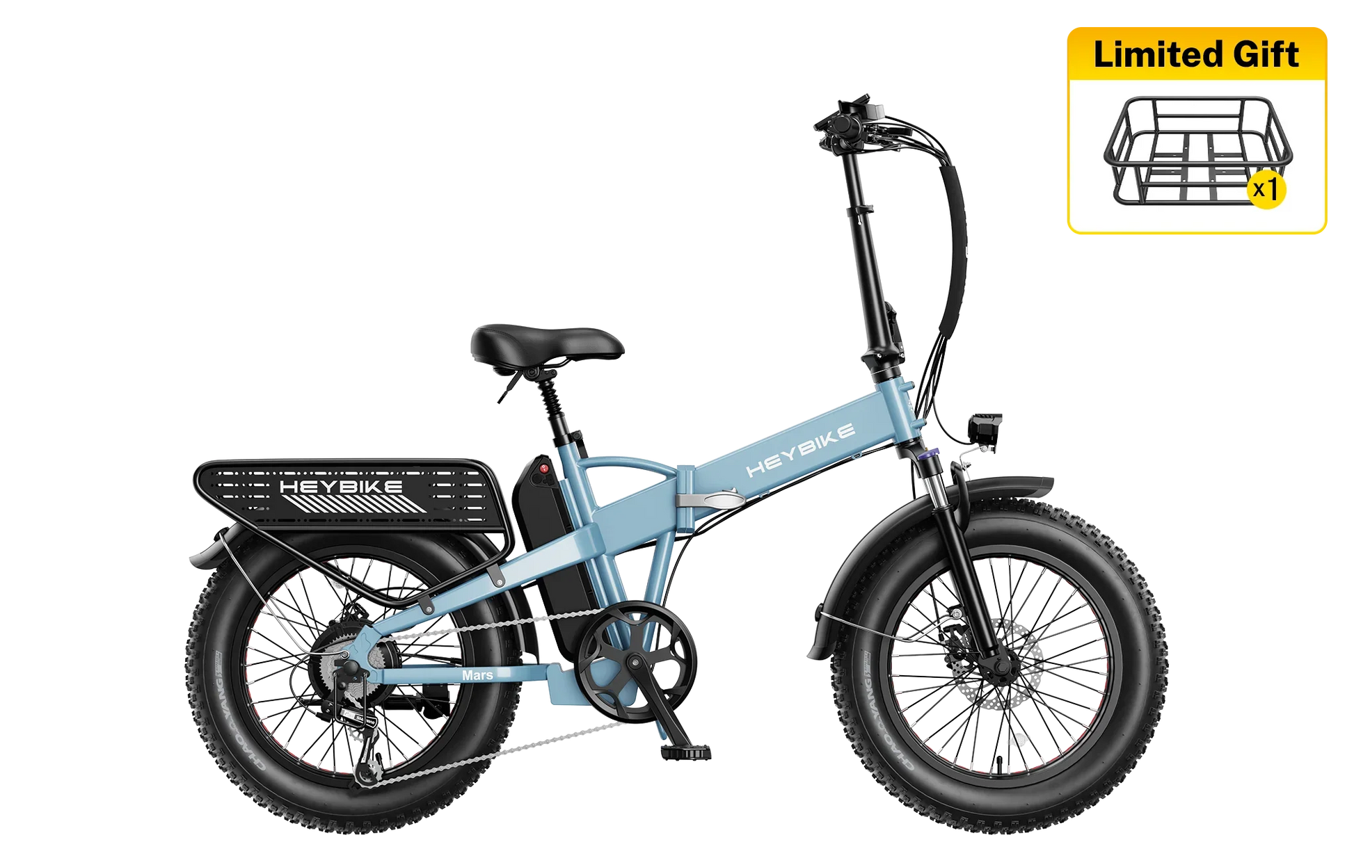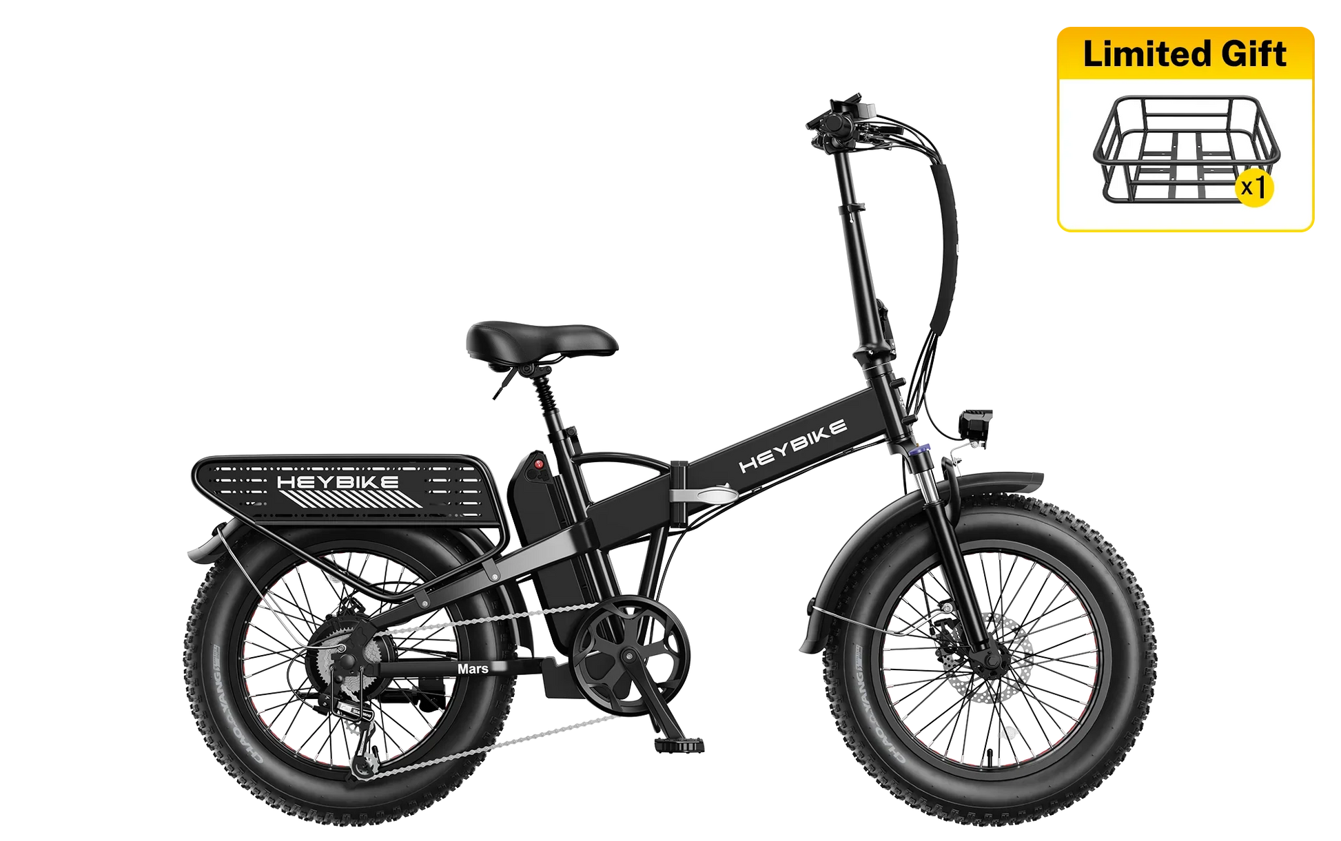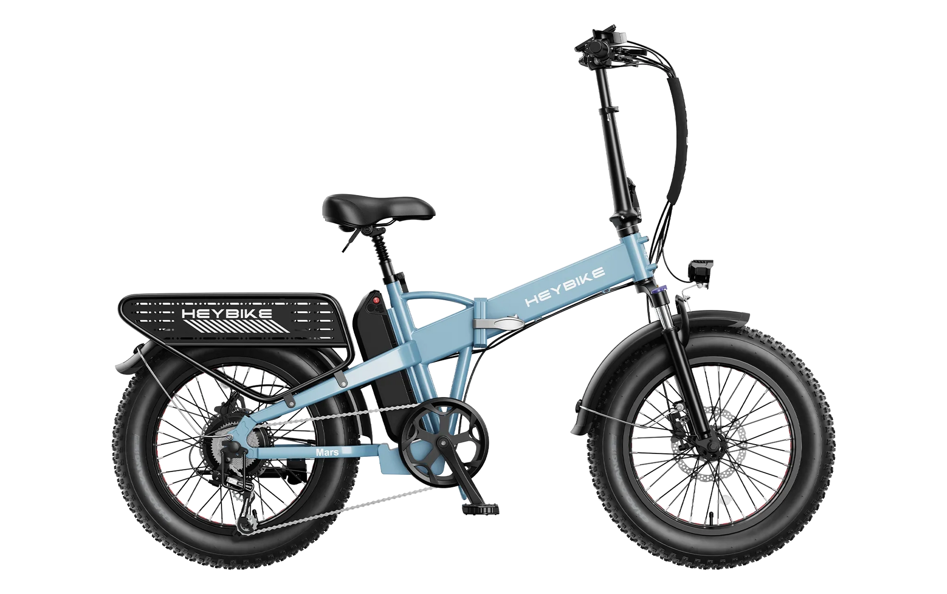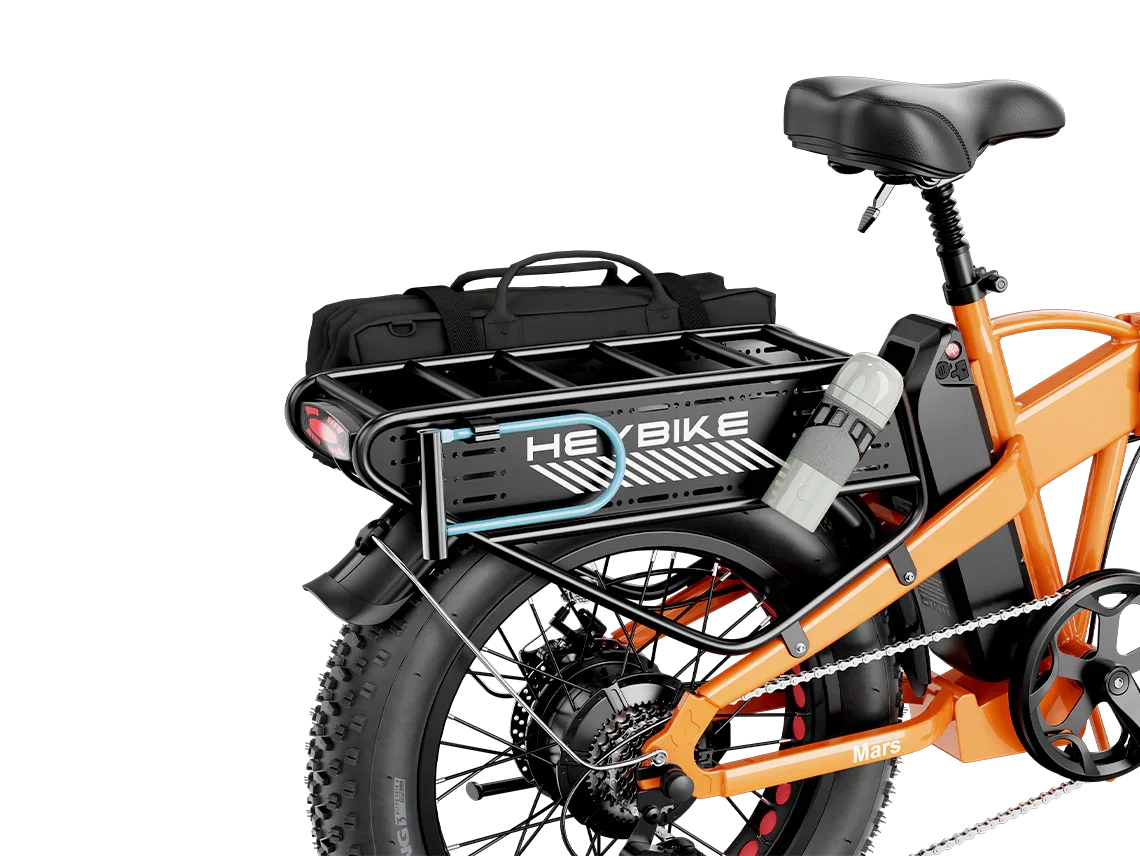 | Tires & Suspension | 20×4.0” fat tires; front suspension with lock-out & preload adjustment Heybike |