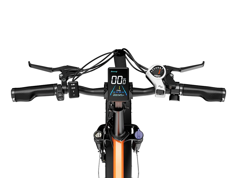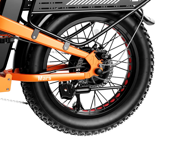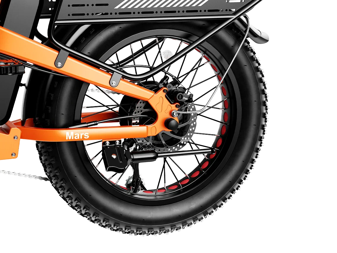 Stable ride over any terrain — The 20″ × 4″ fat tires + front suspension (65 mm travel, adjustable) soak up bumps, sand, gravel and snow. Dry pavement or wet trail—Mars 2.0 handles both with ease.