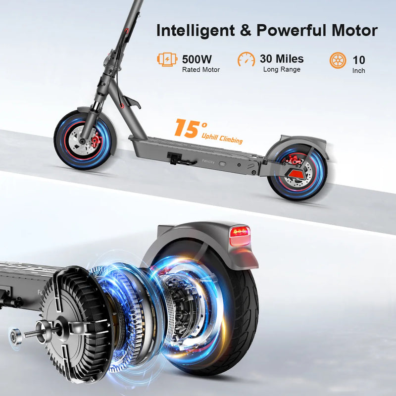 Introducing the HOVSCO Felicity 10" Folding Electric Scooter, a premium ride designed to elevate your commuting experience. With its powerful 450W motor, this scooter delivers an exhilarating top speed of 21 MPH and an impressive range of 30 miles, ensuring you can travel longer distances effortlessly. Its sleek foldable design allows for easy storage and portability, making it ideal for both city commutes and weekend adventures.