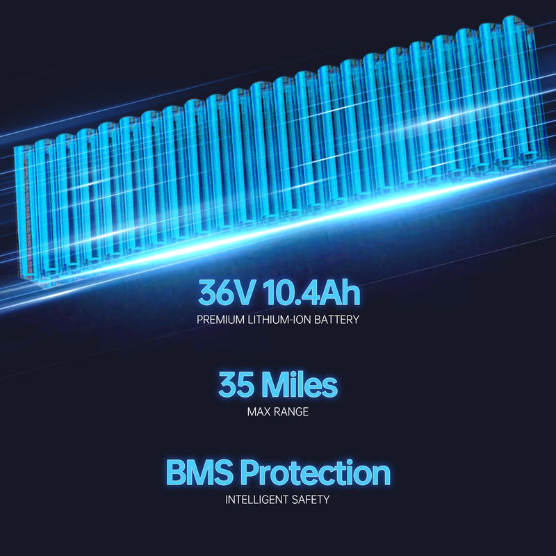 - Extended Range: The 36V10.4Ah lithium-ion battery provides an impressive range of 35 miles, perfect for both short and medium journeys.