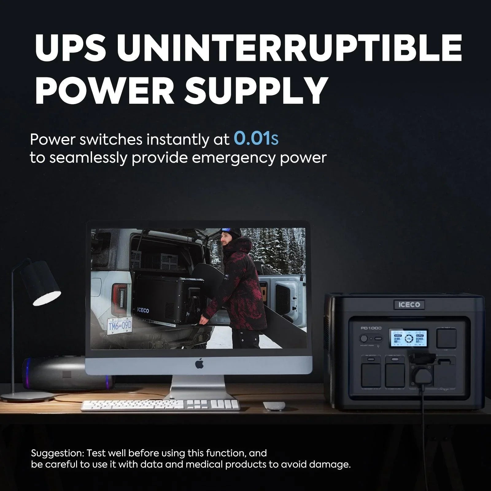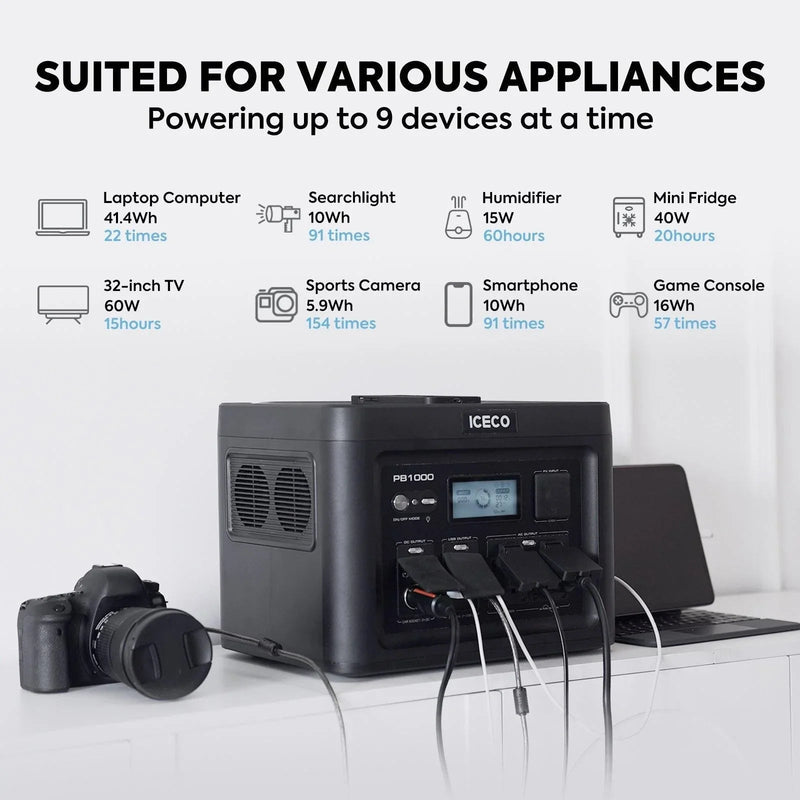 Introducing the ICECO PB1000 Portable Power Station, your ultimate solution for reliable power on the go. Whether you're camping in the wilderness, tailgating with friends, or preparing for an unexpected blackout, this versatile power station is designed to meet all your energy needs. With a robust 1057Wh capacity and 1200 watts output power, you can rest assured that your devices will stay charged and ready for action.
