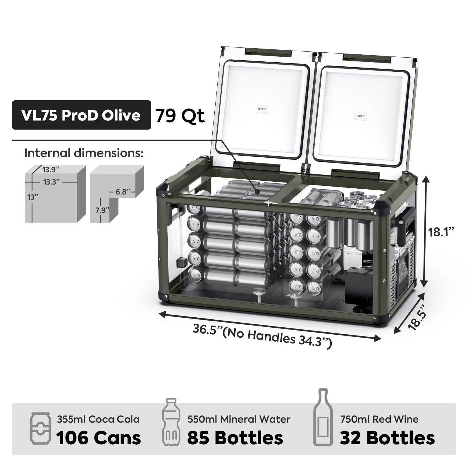 Introducing the ICECO VL75ProD 79.2QT Olive 12V Heavy Duty Metal Fridge Freezer, your ultimate companion for adventure and outdoor experiences. Engineered with innovation and durability in mind, this fridge freezer not only offers generous storage but also exceptional cooling performance, making it ideal for camping trips, road trips, or backyard barbecues.