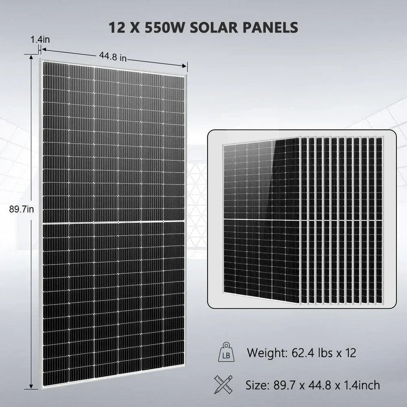 - High Efficiency: Featuring 12 state-of-the-art 550 Watt monocrystalline solar panels, this kit ensures optimal energy capture throughout the day, maximizing your solar power generation.