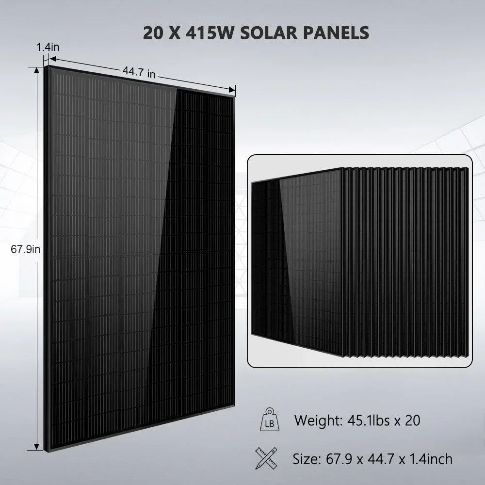 - Environmentally Friendly: Utilizing 20 high-efficiency 415-watt monocrystalline solar panels, you can generate clean, renewable energy, contributing to a greener planet.