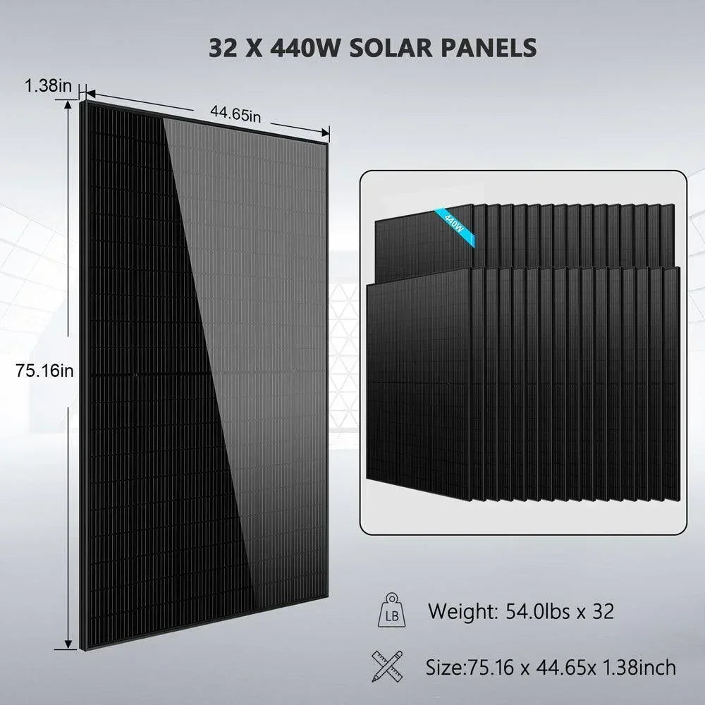 - Powerful Energy Production: With 32 x 440W monocrystalline solar panels, this kit delivers a robust energy output, ensuring you generate ample power for all your needs.
