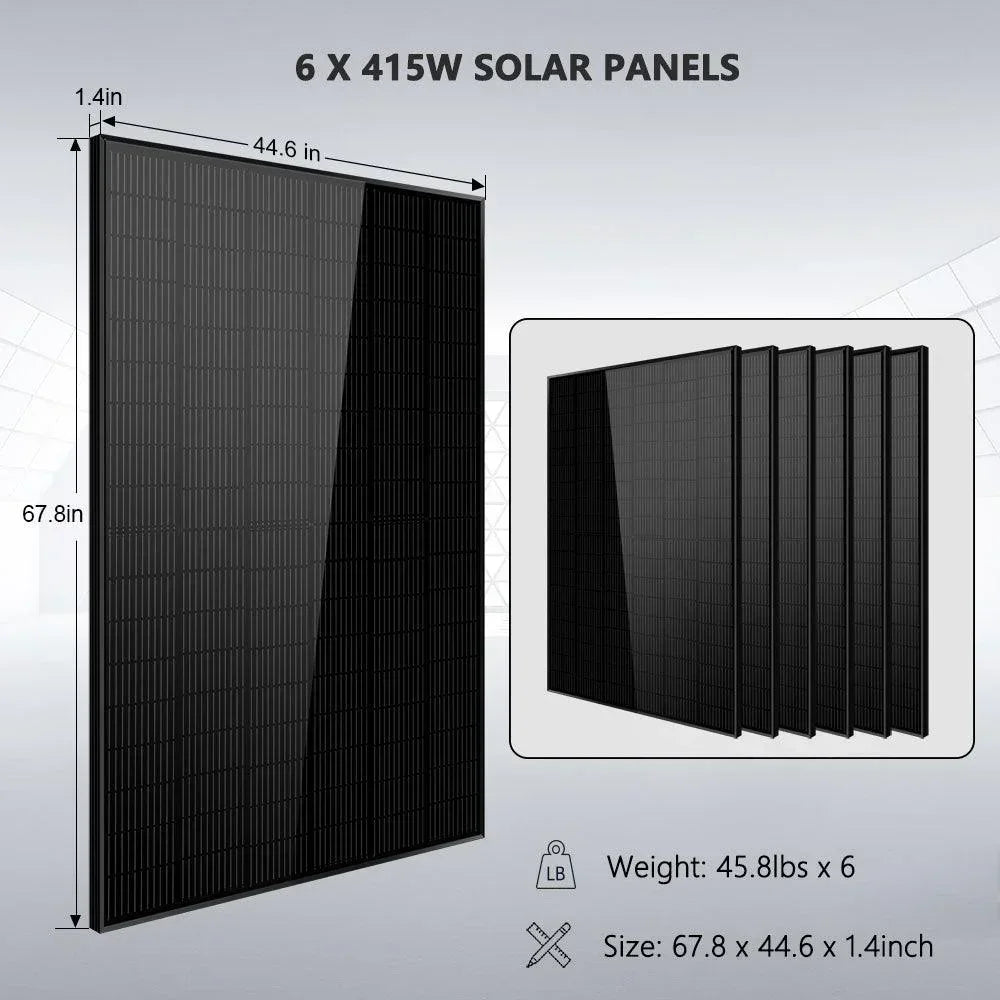 - High Efficiency: Includes 6 x 415 Watt Monocrystalline Solar Panels that maximize solar capture, ensuring optimal performance.