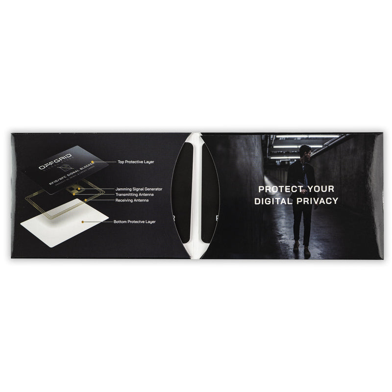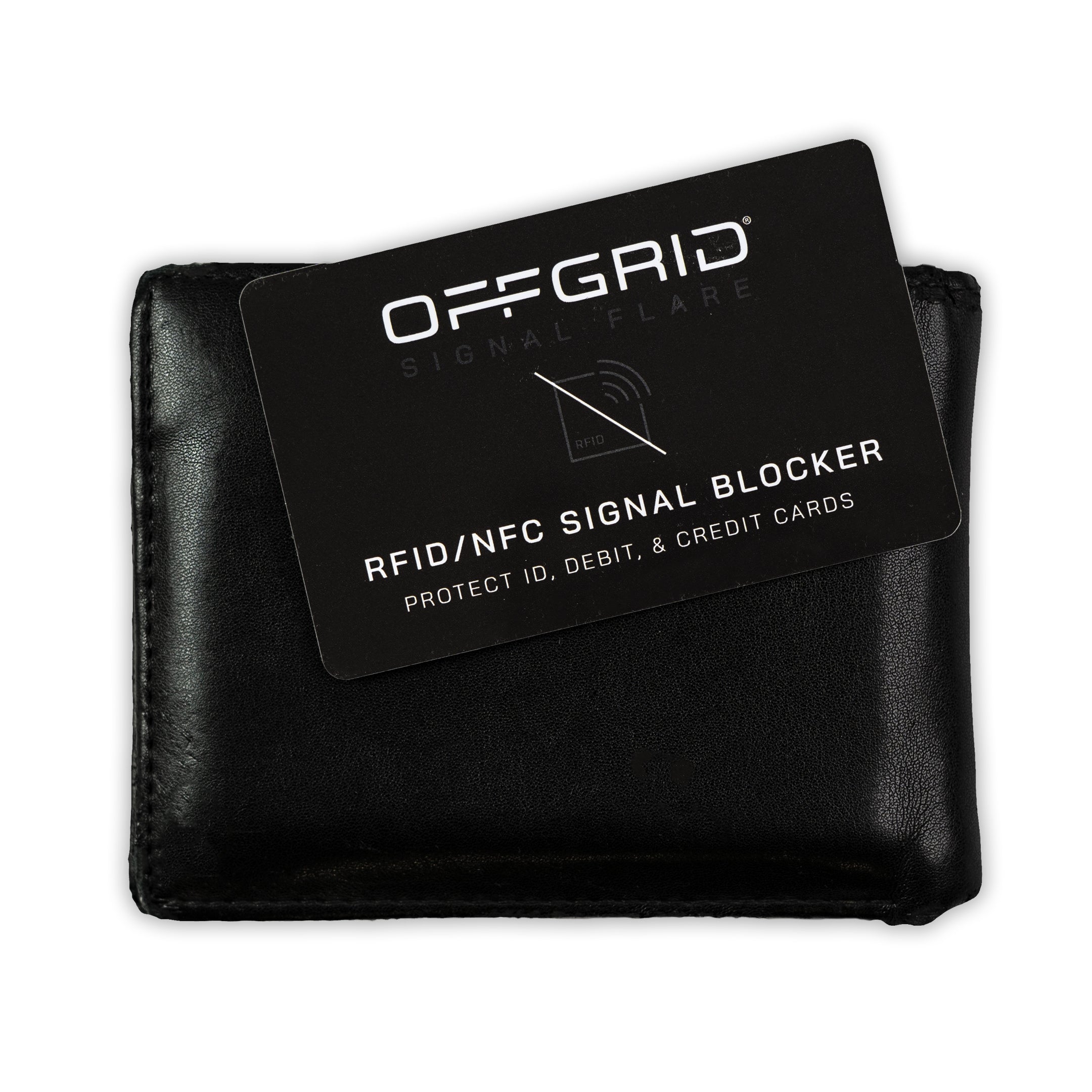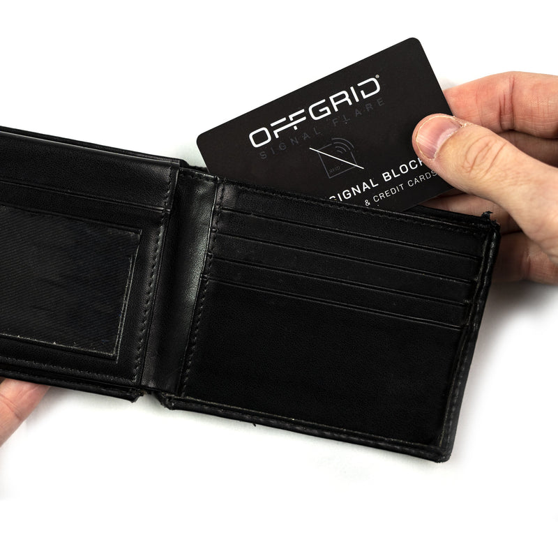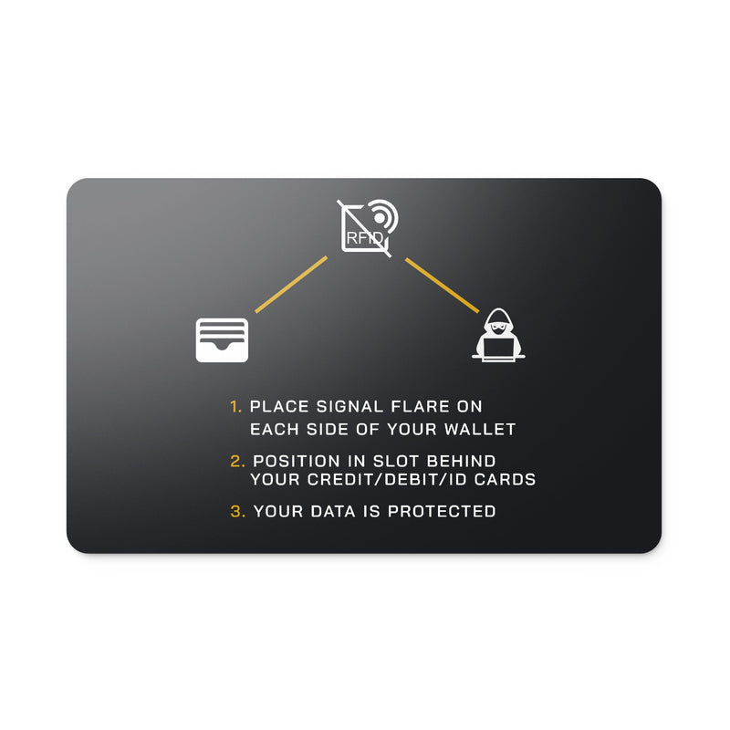 The OffGrid Signal Flare creates a barrier around your wallet or purse to ward off scanners and scammers. Simply place one Signal Flare behind your credit or debit card on each side of your wallet to instantly block RFID and NFC signals that could be trying to access your personal data.