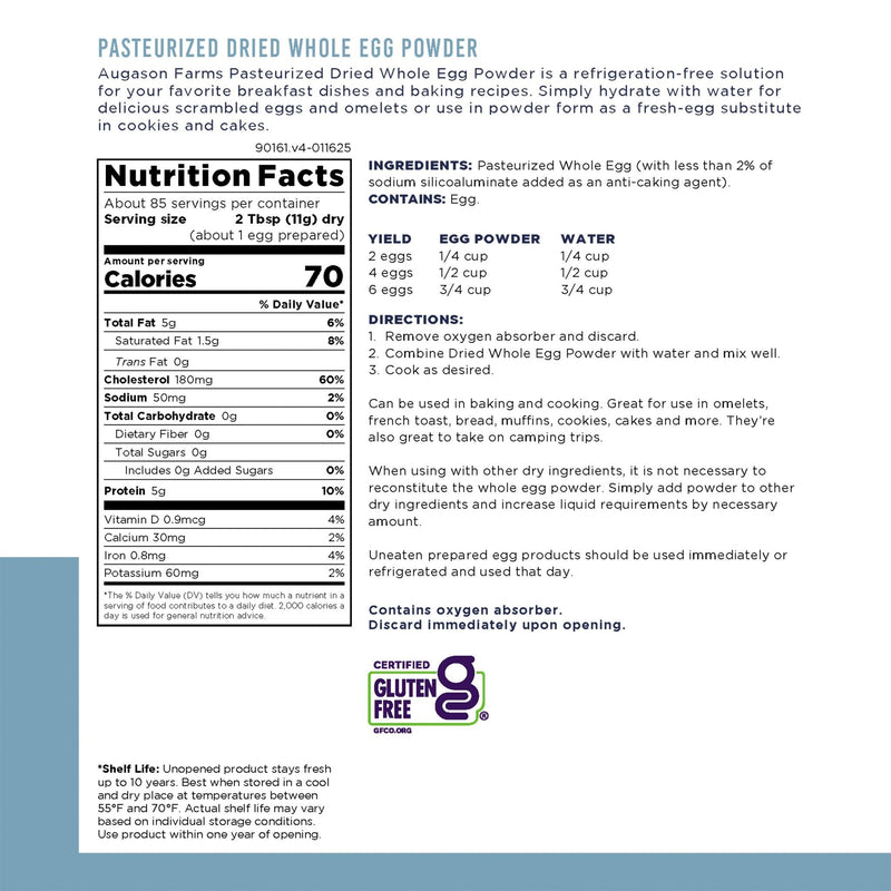 Made from 100% natural egg whites and yolks, Augason Farms dried whole egg powder is ideal for baking and cooking. Hydrate with water for scrambled eggs and omelets or use the powder form for a refrigeration-free substitute in baking recipes.