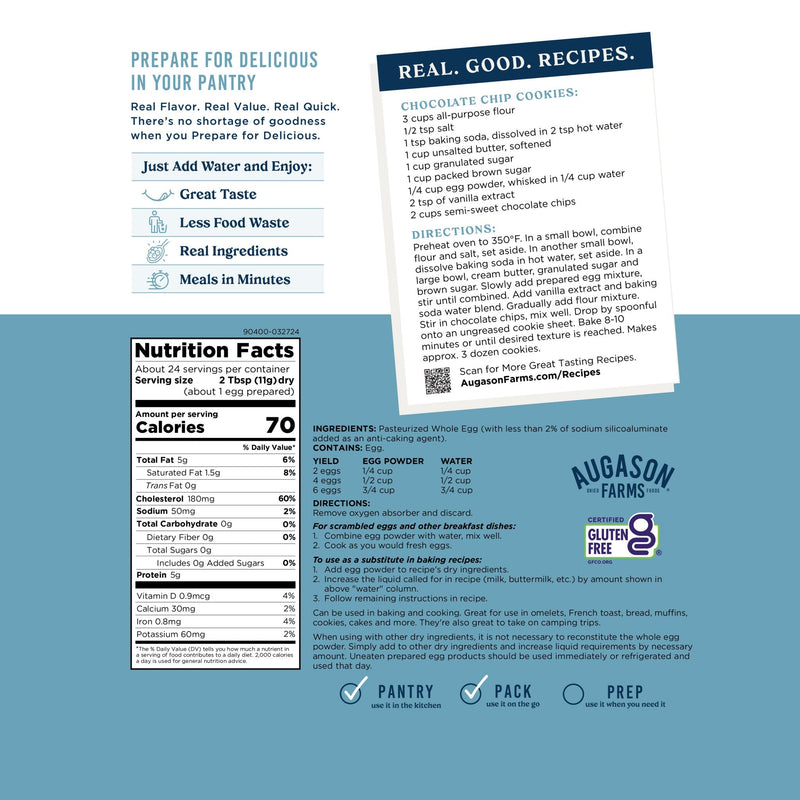 Made from natural egg whites and yolks, Augason Farms dried whole egg powder is ideal for baking and cooking. Hydrate with water for scrambled eggs and omelets or use the powder form for a refrigeration-free substitute in baking recipes.