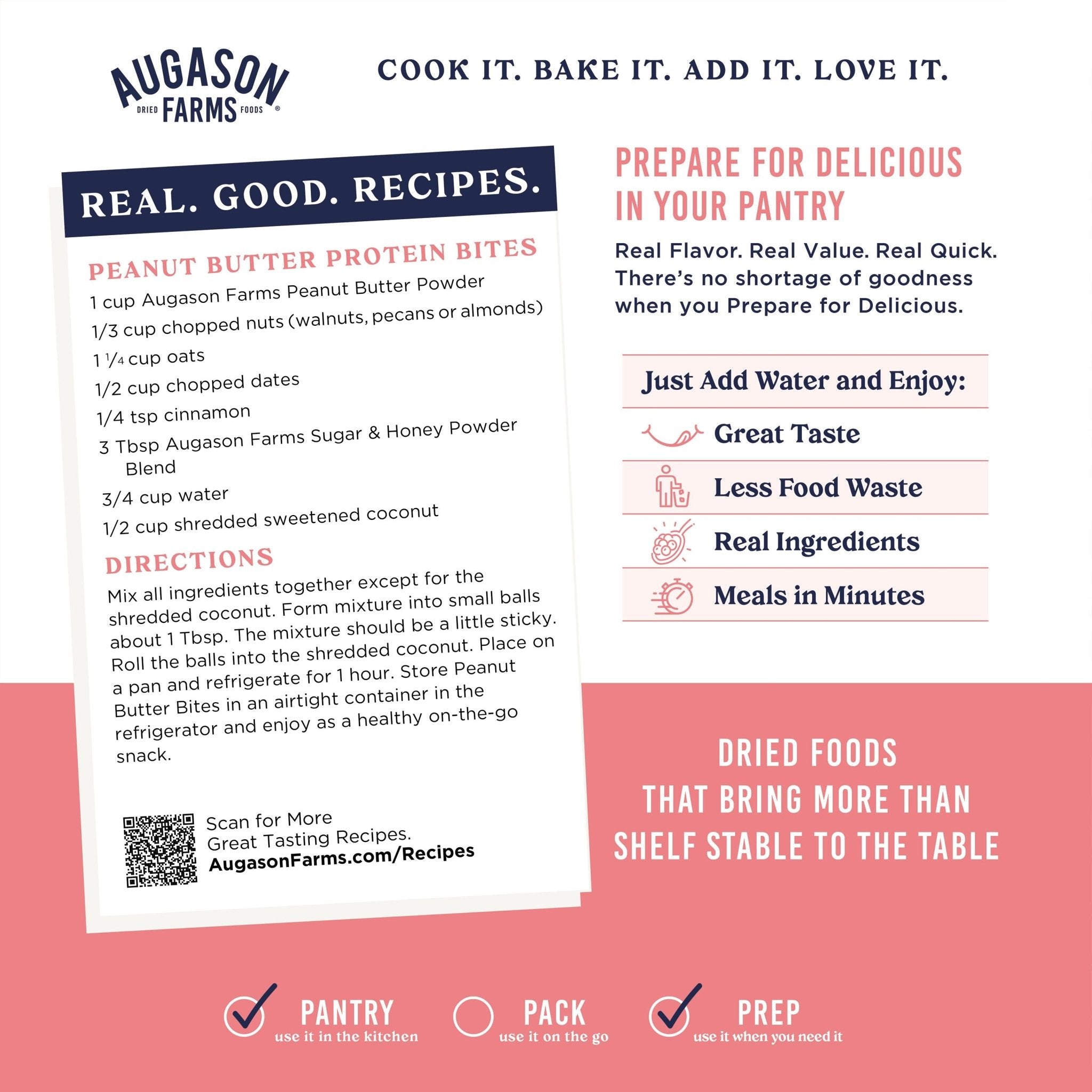 Augason Farms Peanut Butter Powder delivers the rich, nutty flavor of real peanut butter in a lightweight, shelf-stable form. Mix with water for a smooth, spreadable peanut butter, or use the powder dry to add flavor and protein to smoothies, toast, popcorn, and baked goods. With zero grams of saturated fat and a long shelf life, it’s perfect for home use, travel, or emergency food storage.