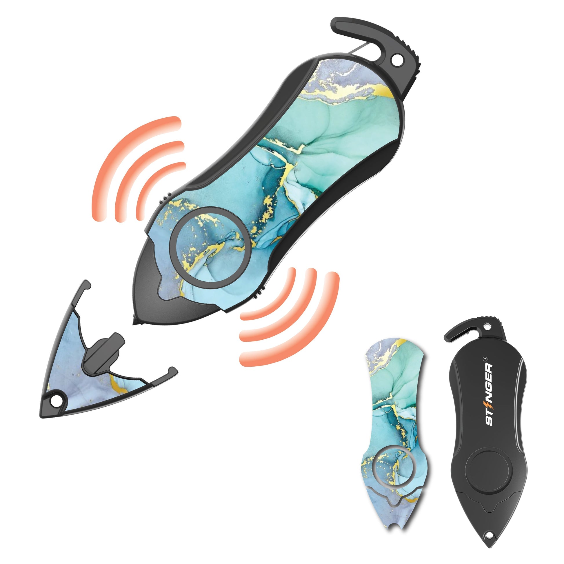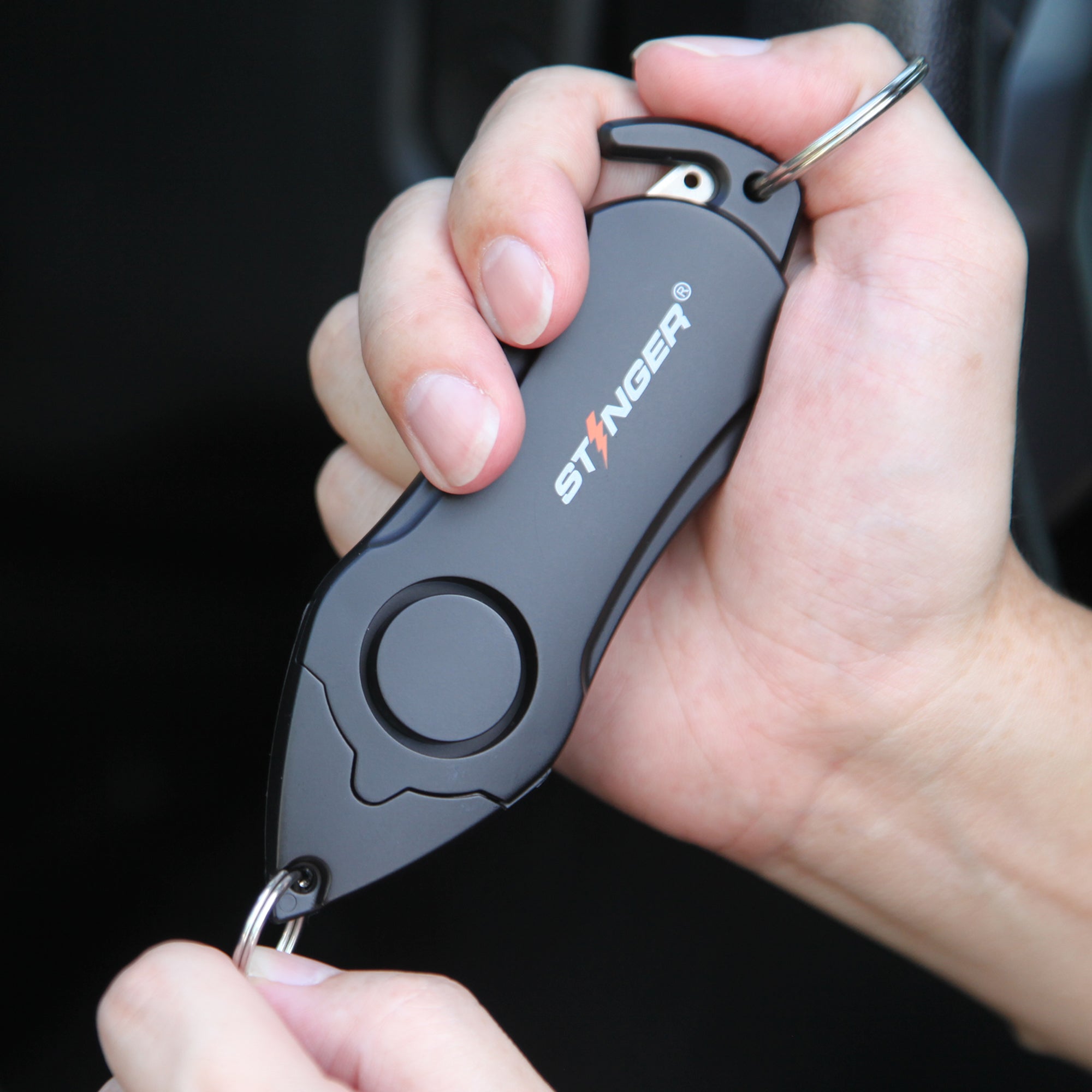 The Stinger Personal Alarm is a compact 3-in-1 emergency tool that combines a personal safety alarm siren, a seatbelt cutter, and a hardened steel car window breaker.