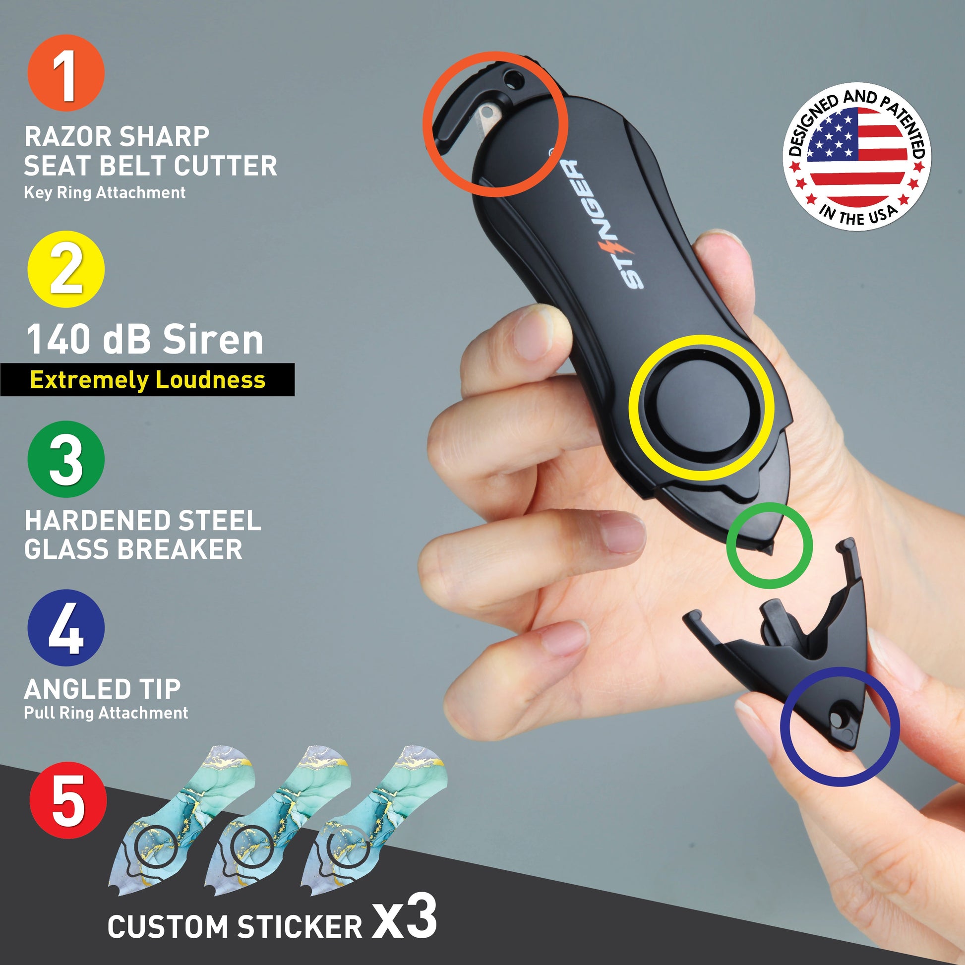 - RAZOR SHARP SEAT BELT CUTTER: Stinger Personal Alarm Emergency Tool comes with a razor-sharp blade to help you cut your seatbelt if you find yourself unable to release it normally. It cuts easily through safety belts to free trapped drivers and passengers. It increases the survival rate.