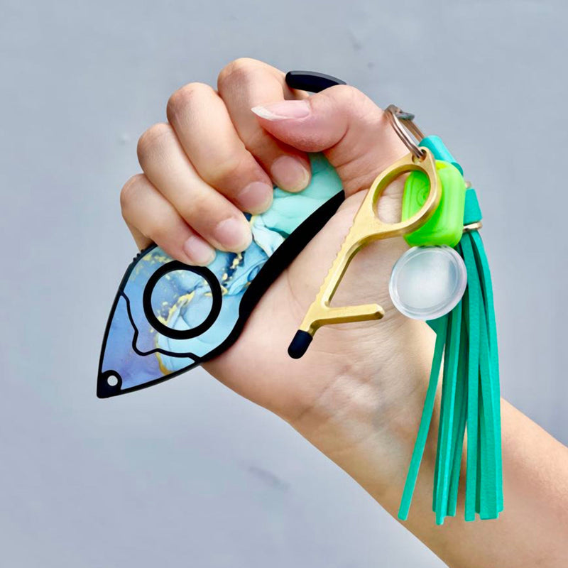 Personal Alarm Keychain Set: Safety Panic Alarm Siren, Seatbelt Cutter, Car Window Breaker, Wristlet Keychain, Contactless Key Tool, Pocket Flashlight (Green Marble) (SC)