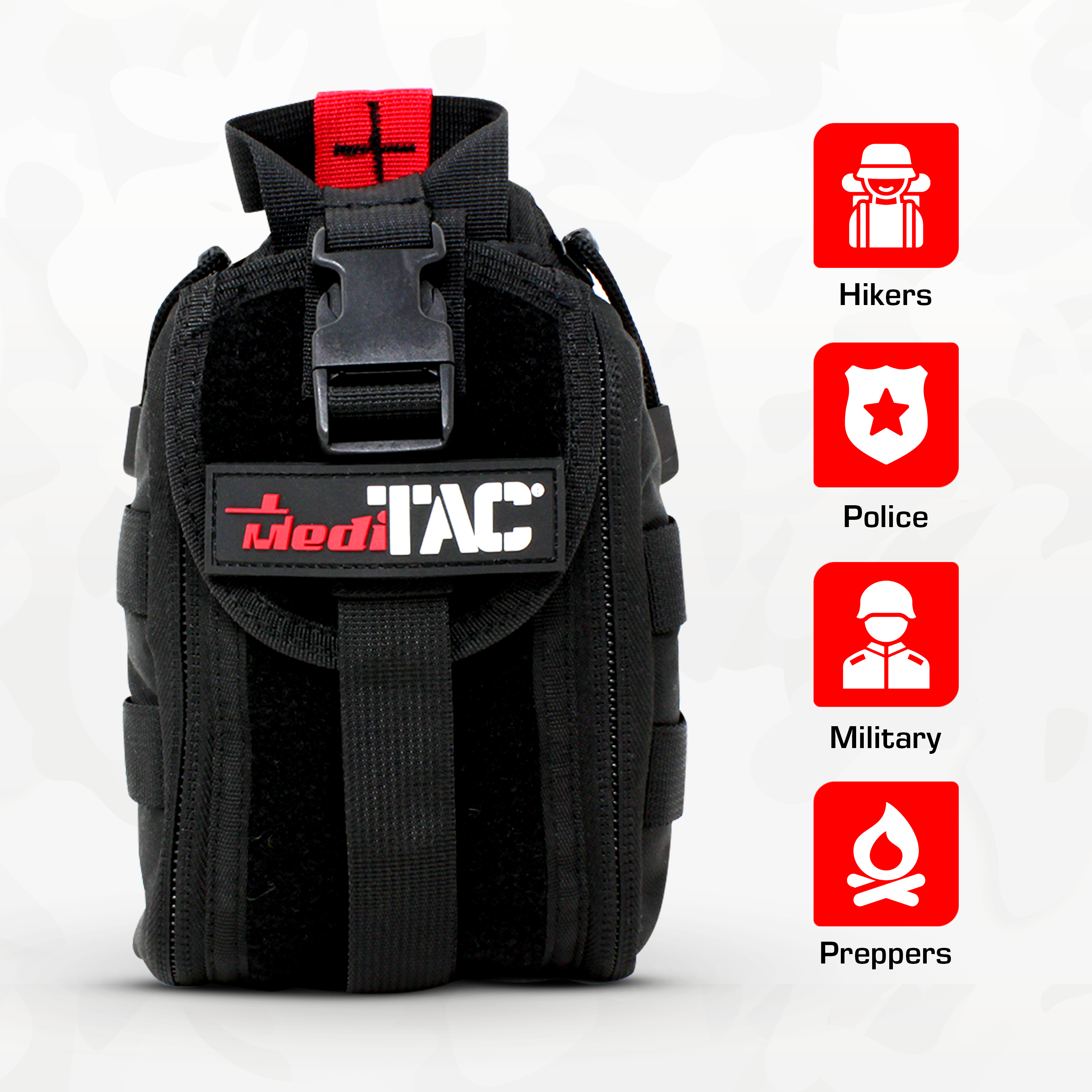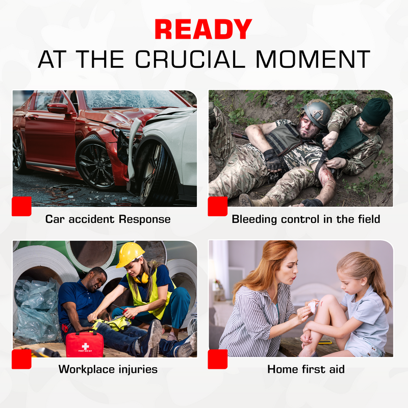 Includes SOF tourniquet, Celox granules, and pressure bandage for effective bleeding control.