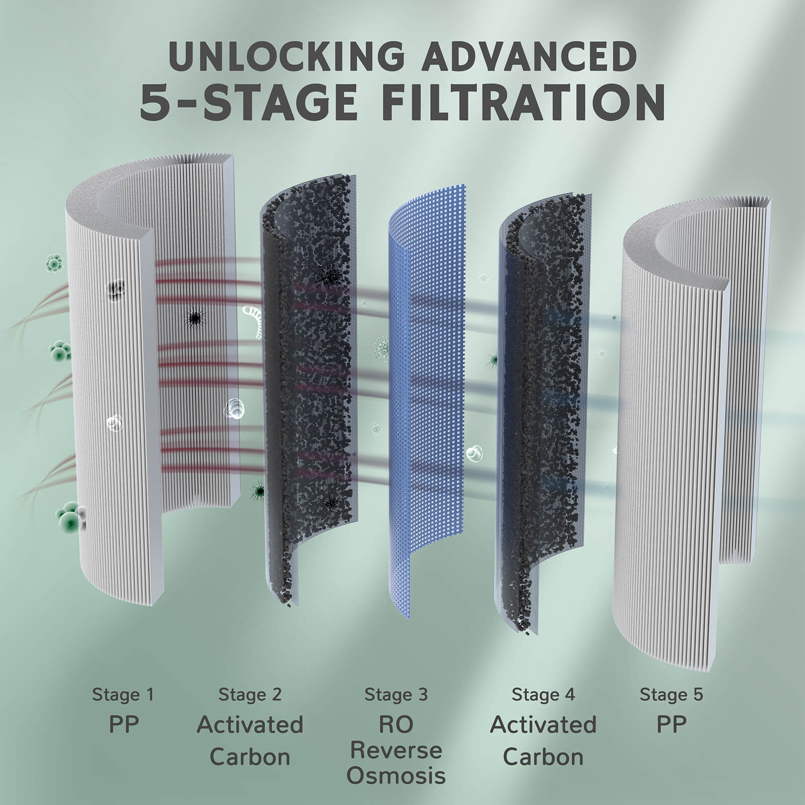 Against NSF/ANSI 58, 53, and 42 standards, as well as EPA 200, 300, and 537 regulations. Harnessing the power of a 5-stage filtration system—1 RO and 1 PCB—combined with PP - carbon - 0.0001 micron RO - carbon - PP, our system eradicates 99% of common tap water pollutants and impurities.