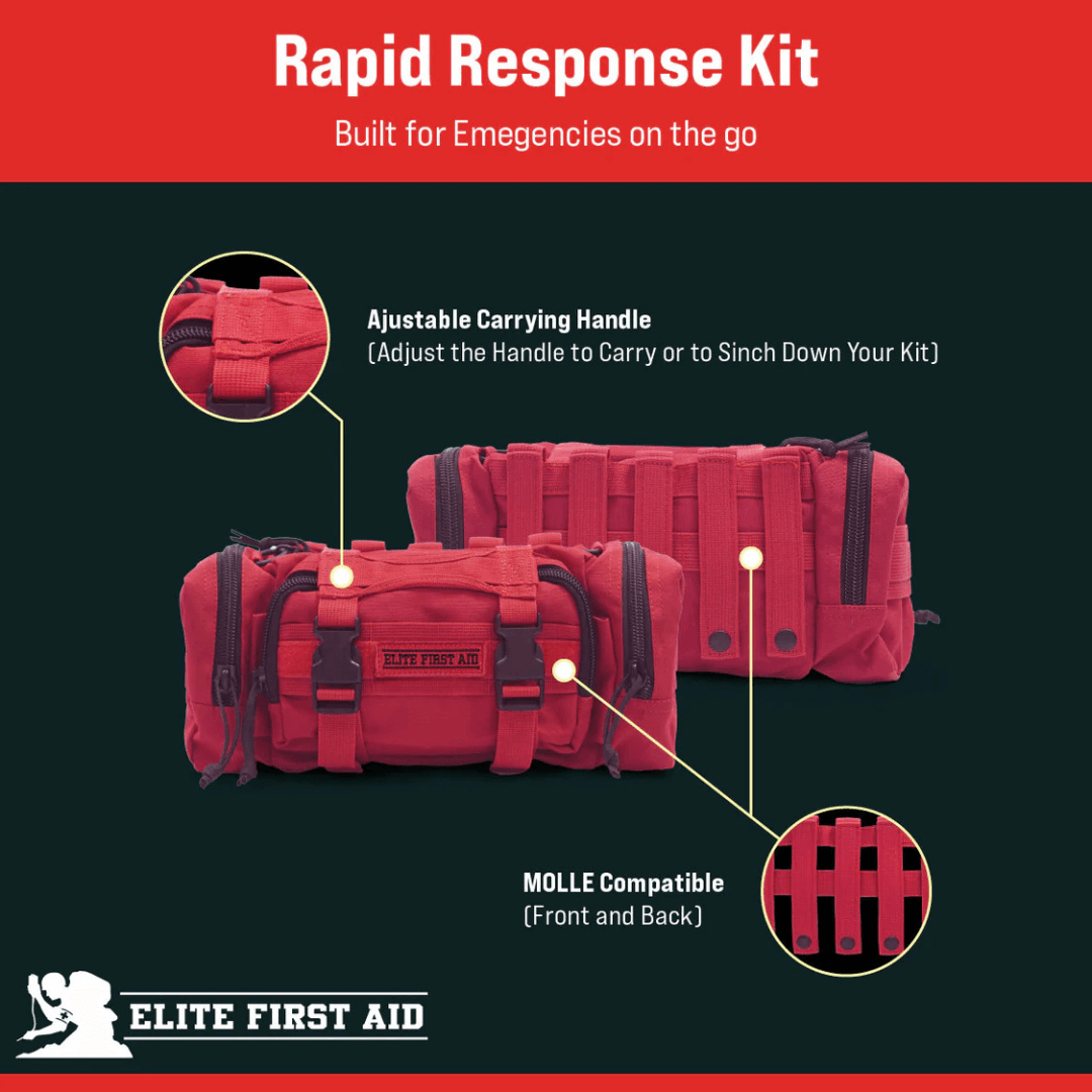 Built on feedback from tactical professionals, this lightweight, MOLLE-compatible, Rapid Response Trauma kit is designed to ensure bleeding control essentials like a tourniquet, hemostatic gauze, and trauma dressings are organized for immediate access when every second counts.