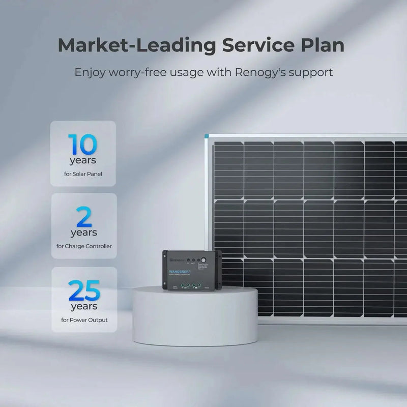 This Renogy Solar Kit includes all of the equipment necessary for building a new system. The included cables, Z-brackets, and pre-drilled holes on the back frame of the panel allow fast and secure mounting. With the Wanderer Li 30A PWM Charge Controller, the kit can meet your further power needs by adding more of the same solar panels to expand up to 400W.