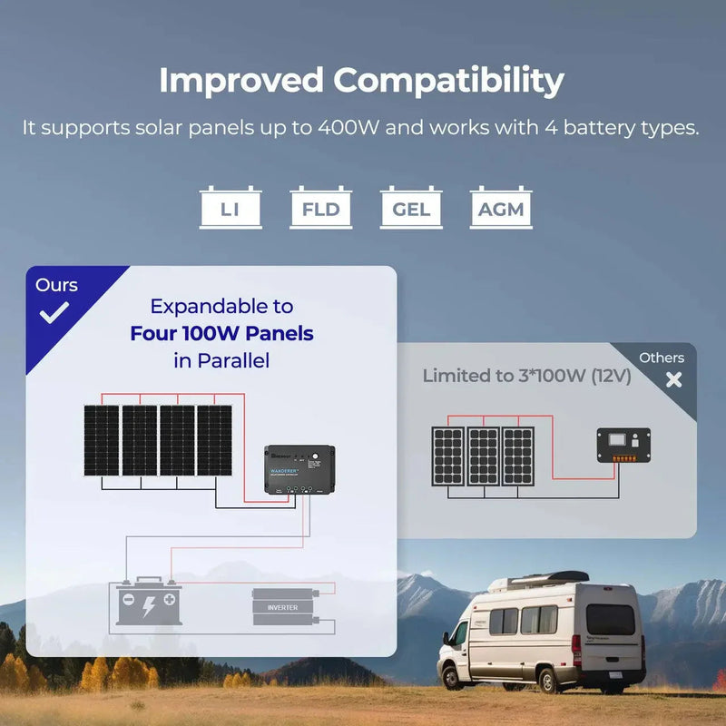 The included Wanderer Li 30A PWM charge controller supports sealed, gel, flooded, and lithium batteries. It features intelligent 4-stage charging (bulk, boost, float, equalisation) for faster, safer battery maintenance and improved longevity.