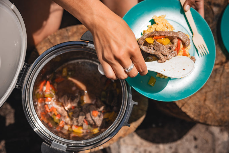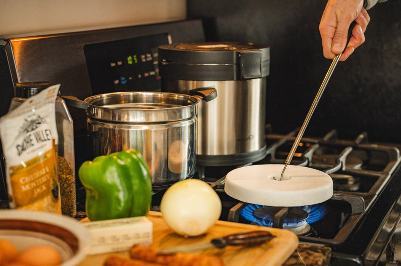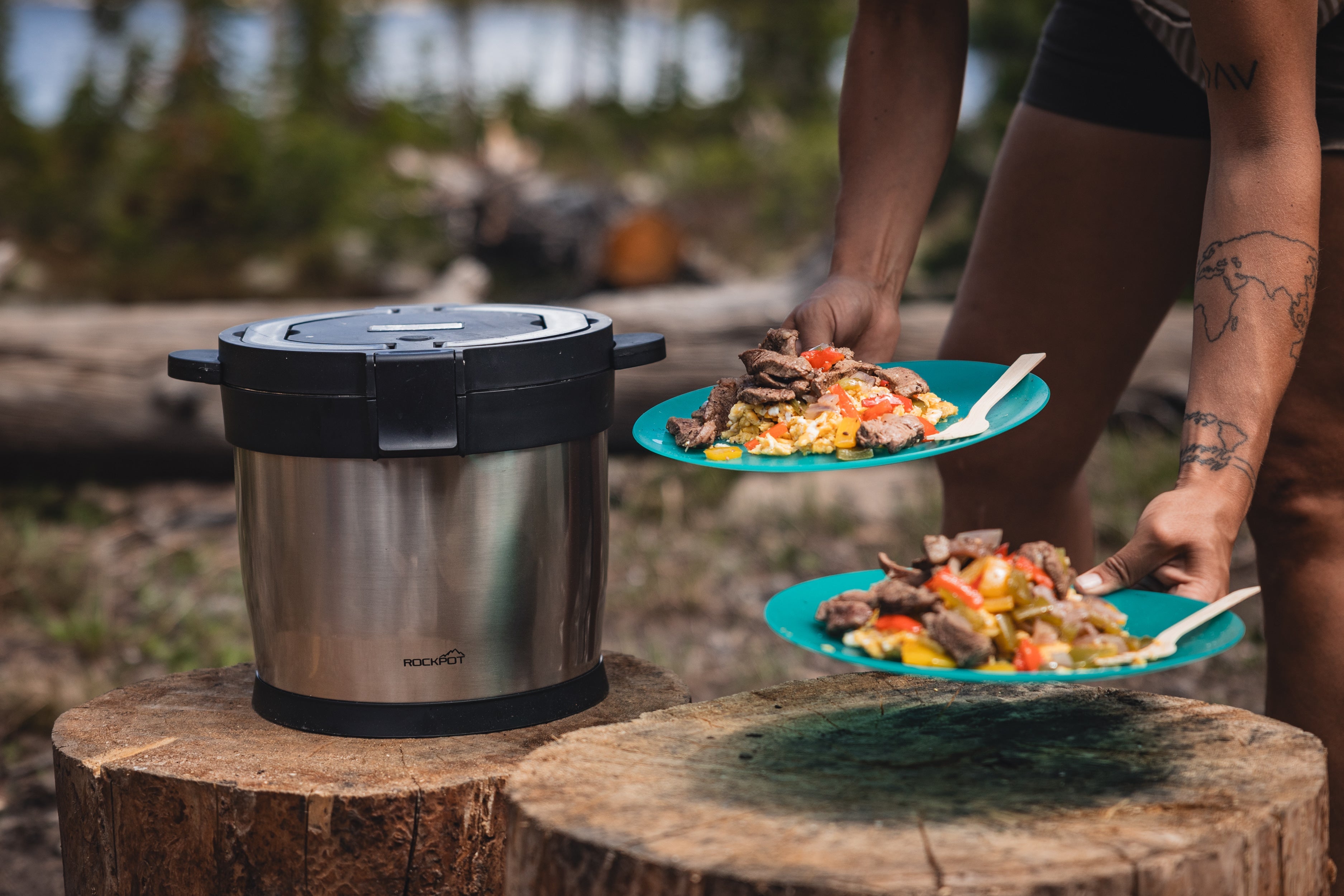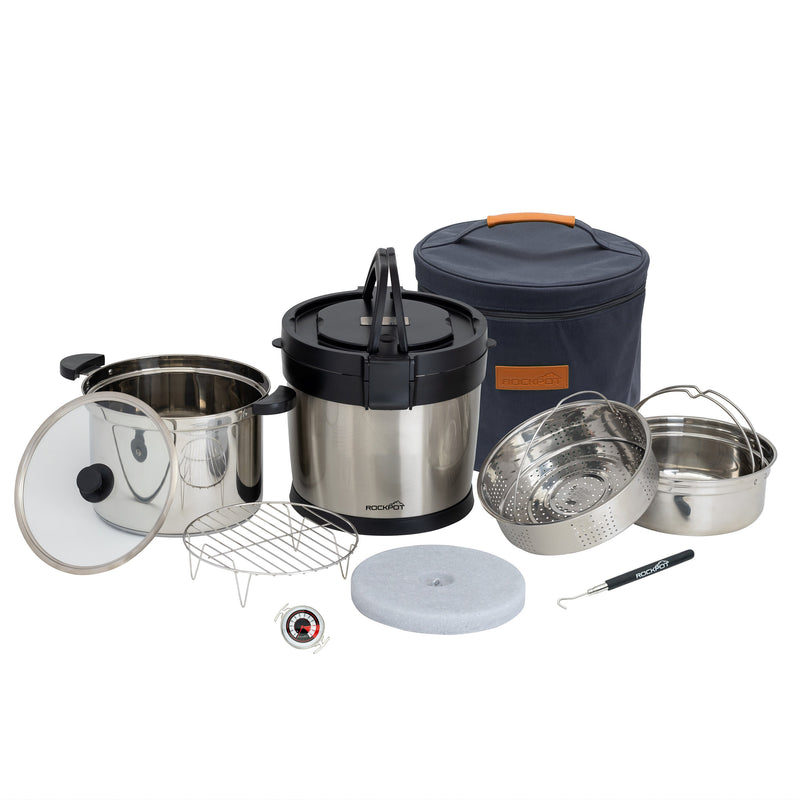 The RockPot is an easy-to-use portable cooker that requires no propane or electricity that can cook raw food. The RockTablet is our stone-based heating source for RockPot and can be heated over an open fire or over a stovetop (gas, electric, glass or butane) and can be reheated over thousands of times.