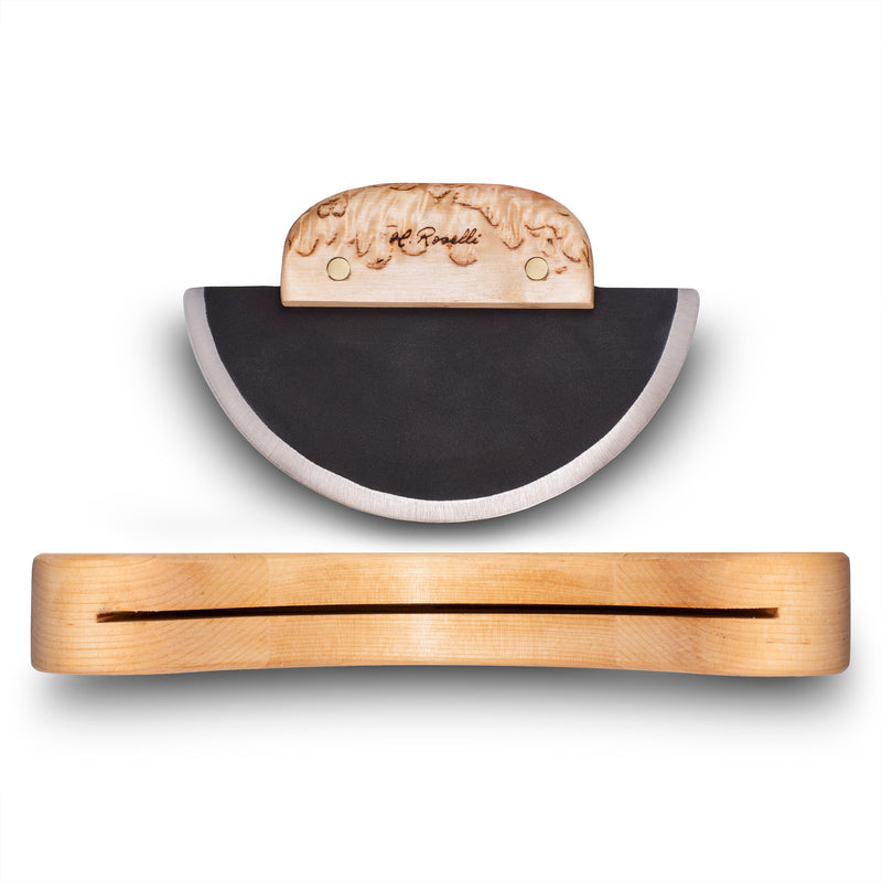 The Roselli Ulu is the knife of the Inuit or Eskimo. It's used for skinning and butchering game, food preparation, making garments, and anything else that requires a sharp edge. Versatile kitchen knife for cutting meat, vegetables, slicing pizza and more. Forged carbon steel blade and curly birch handle. Comes with a birch rack.