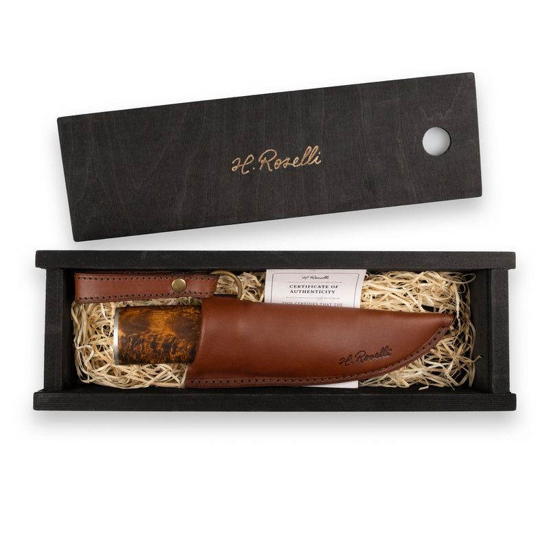 This handmade damascus blade is made from over 1000 layers of steel. The handle is made out of some of the most attractive birch that I have seen, etched and coated with linseed oil for a secure grip, even when in contact with moisture. The handle also features bolsters made with 925 sterling silver. Each piece is unique due to the varied texture of natural materials. Supplied in a handcrafted dark tanned leather sheath.