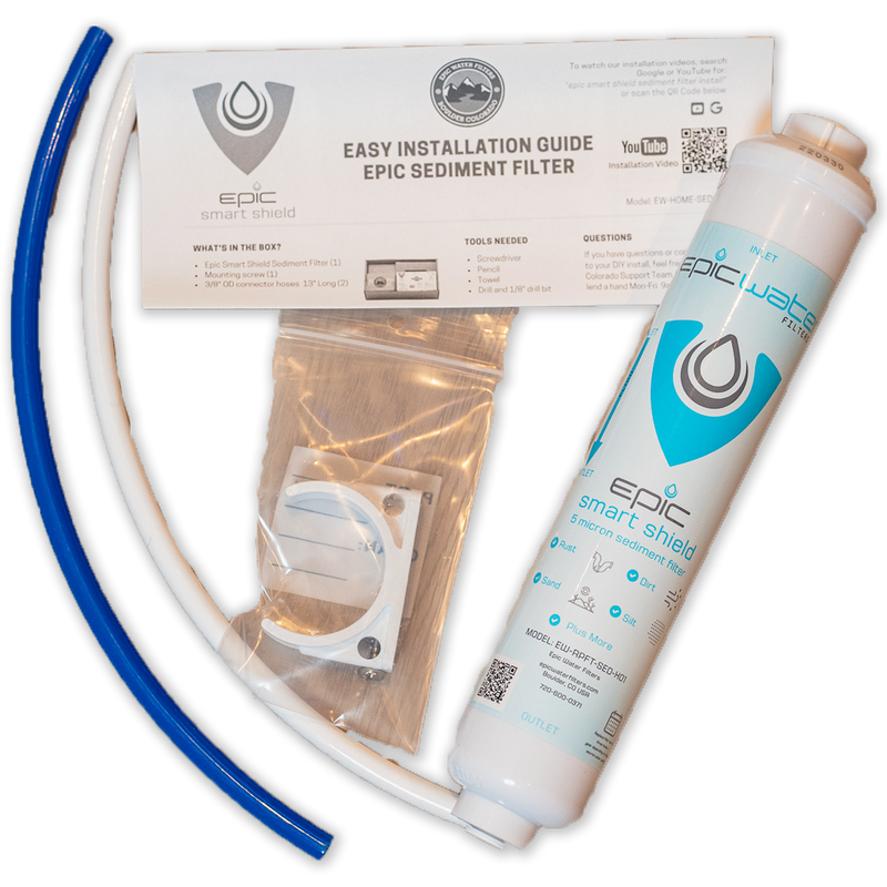 Introducing the Epic Smart Shield 5 Micron Sediment Filter, the ultimate solution for homes in areas with heavy sediment or older homes with questionable water pipes! Say goodbye to the damaging effects of sediment, dirt, rust and debris greater than 5 microns with this complete installation kit that comes with everything you need. The Epic Smart Shield Sediment Filter is the perfect addition to the Epic Smart Shield Direct Connect Filter System (here), which is designed to remove chemicals, heavy metals, industrial pollutants, trace pharmaceuticals, human sex hormones, and microbial cysts from your drinking water. Don't let sediment in city or well water clog up your solid carbon block filters or change the taste of your drinking water. With the Smart Shield Sediment Filter, you can rest assured that particles as small as 5 microns will be removed before they reach your main filter, leaving your Epic Smart Shield Direct Connect Filter free to remove the bad stuff! Get the Epic Smart Shield 5 Micron Sediment Filter today and enjoy cleaner, safer drinking water for you and your family.