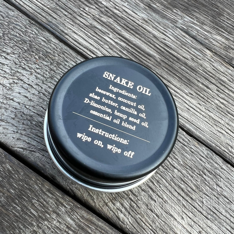 Snake Oil blade salve is an organic conditioning and protective coating for metal and wood. Named after the 19th century cure-all liniments, this wax is excellent for your blade and handle as well as cutting boards and dry hands! Just rub some on and polish off.