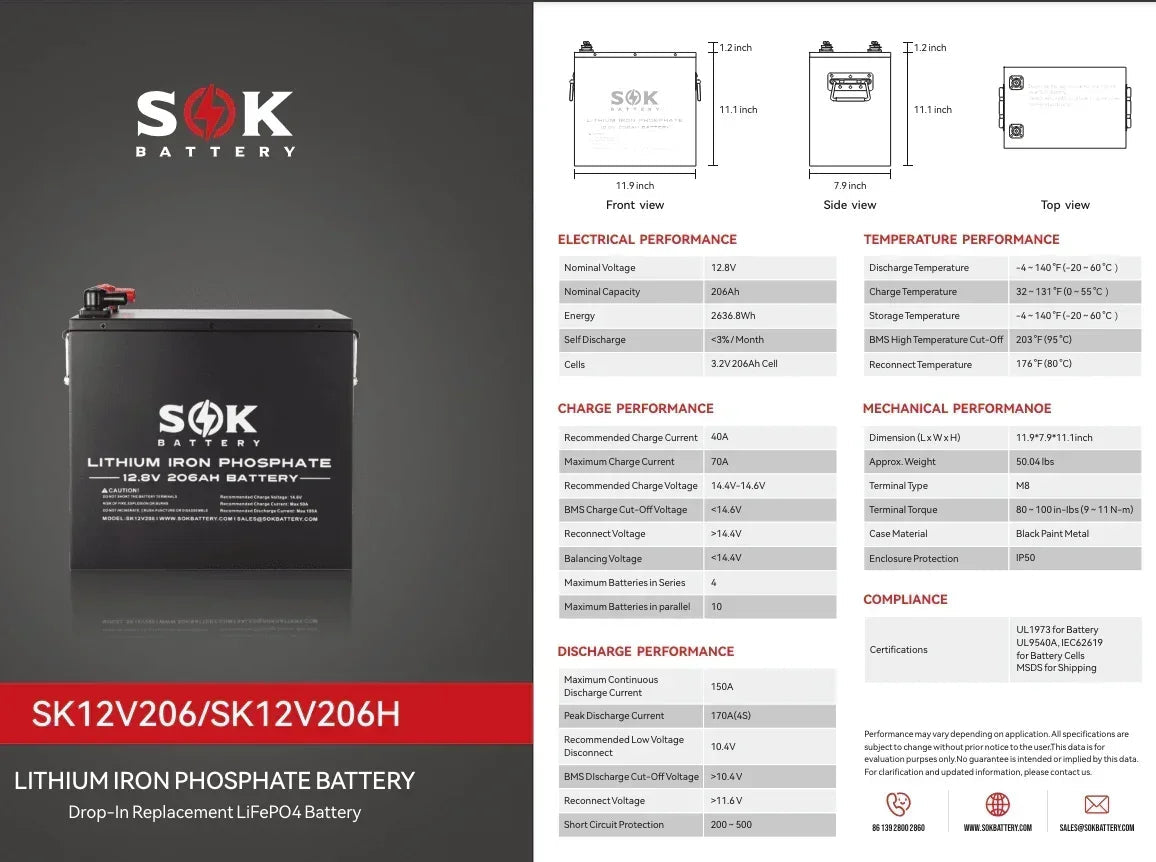 Experience the power and reliability of the SOK Battery 12V 206Ah for all your energy needs. With advanced technology and robust features, this battery stands out as a premier choice for anyone seeking dependable and long-lasting energy solutions.