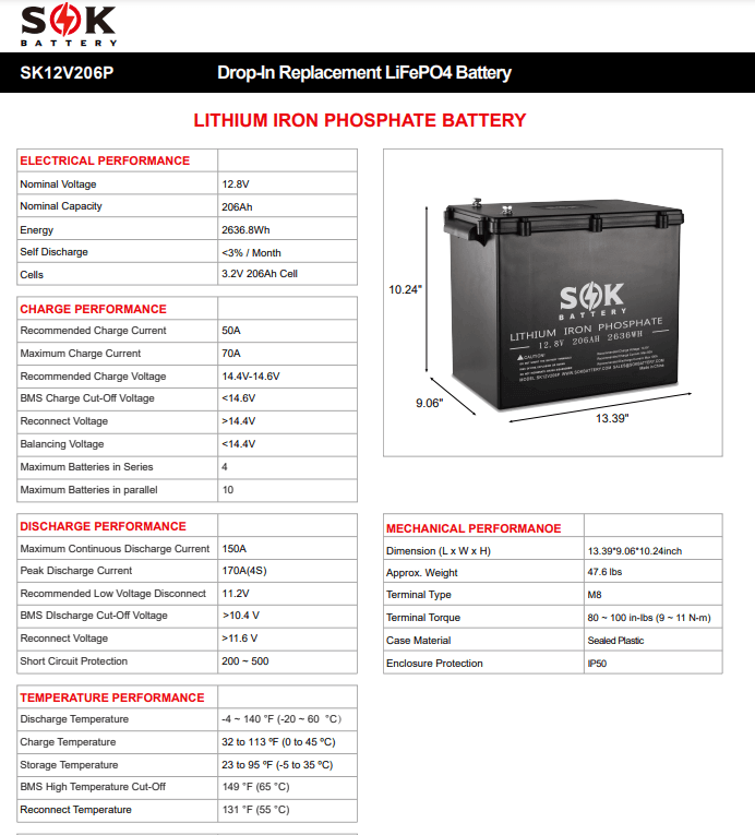 Experience the power and reliability of the SOK Battery 12V 206Ah for all your energy needs. With advanced technology and robust features, this battery stands out as a premier choice for anyone seeking dependable and long-lasting energy solutions.