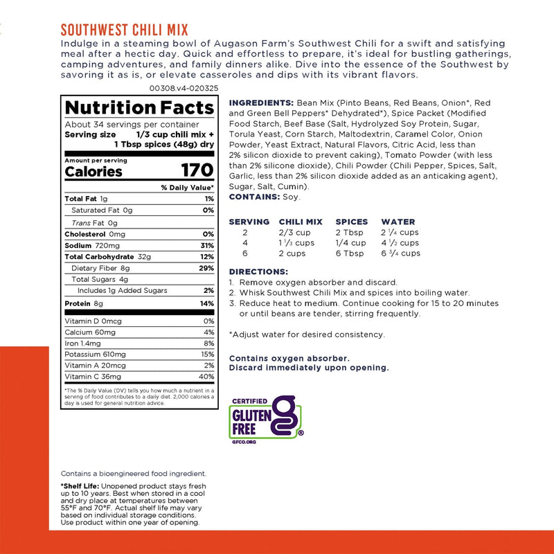 Augason Farms Chili Mix is packed with spicy-sweet flavor and quality dehydrated food ingredients. Pair with cornbread or tortilla chips for a complete meal. Include this homemade chili mix with your emergency food supply and your kitchen pantry for everyday use.