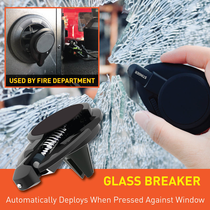 - BREAK AND ESCAPE: The spring-loaded glass breaker works easily and quickly to shatter the side window and give you the best chance of escaping from your vehicle. It can smash the car window in just one stroke. The Stinger will only break the side window. It is not designed to break windshields or laminated glass.