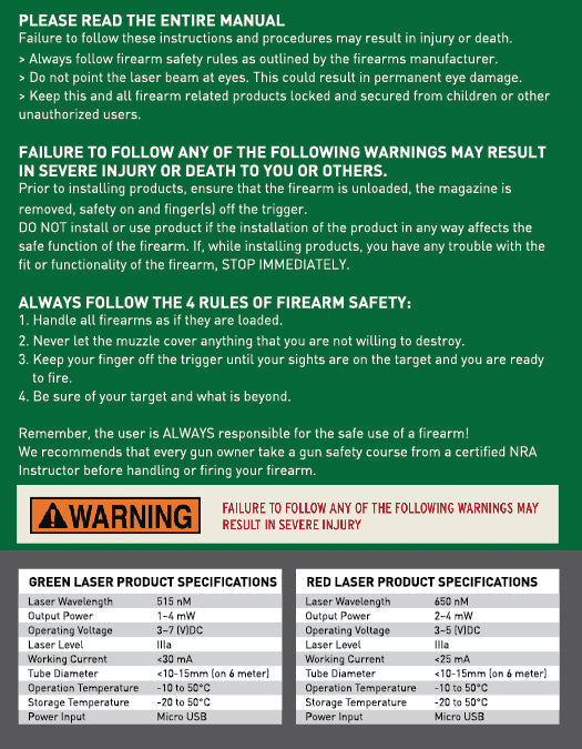 - IIIA Class Green Laser Power Output ≤4mw features 515 nm wavelength, highly visible green laser in any environment. Powered by USB rechargeable battery.
