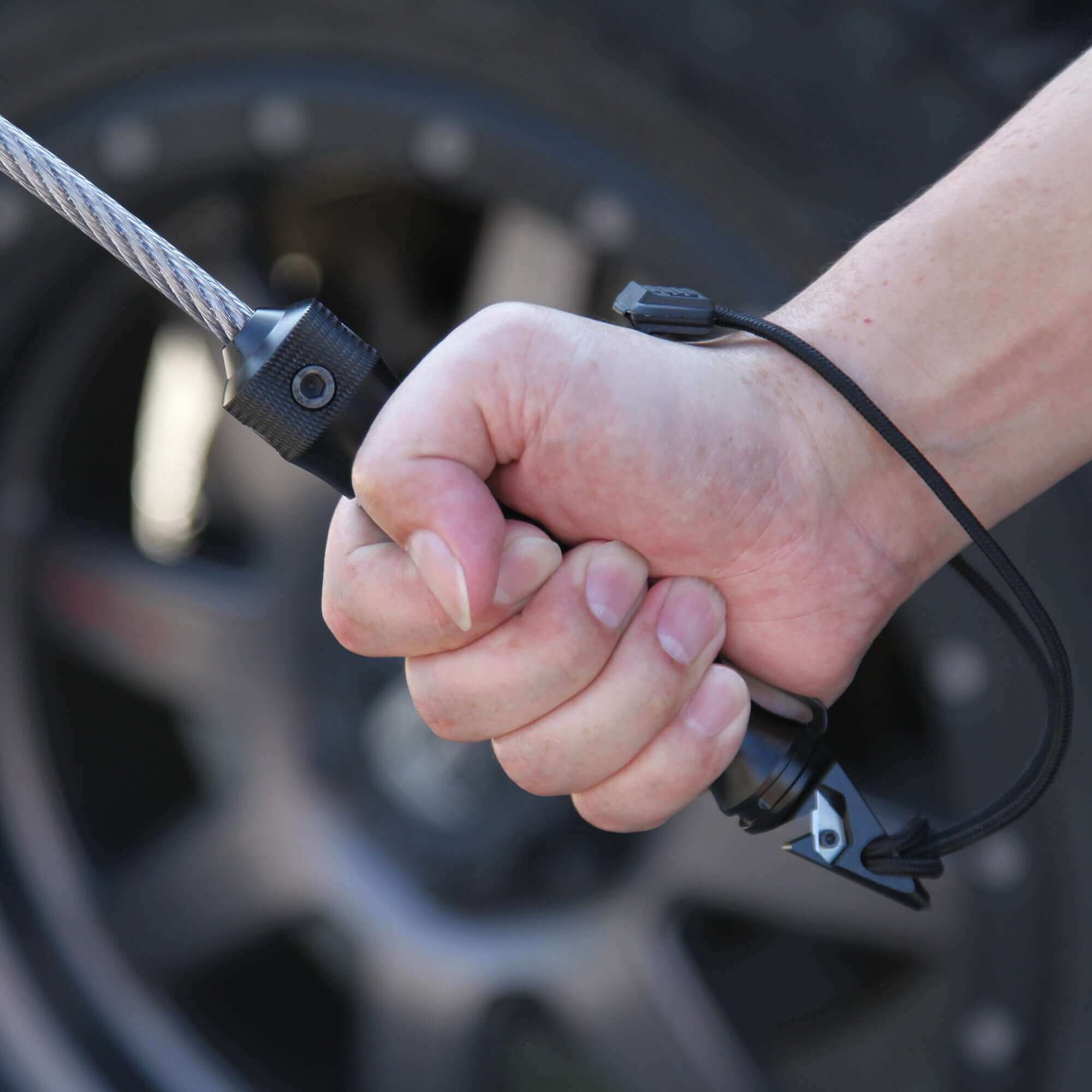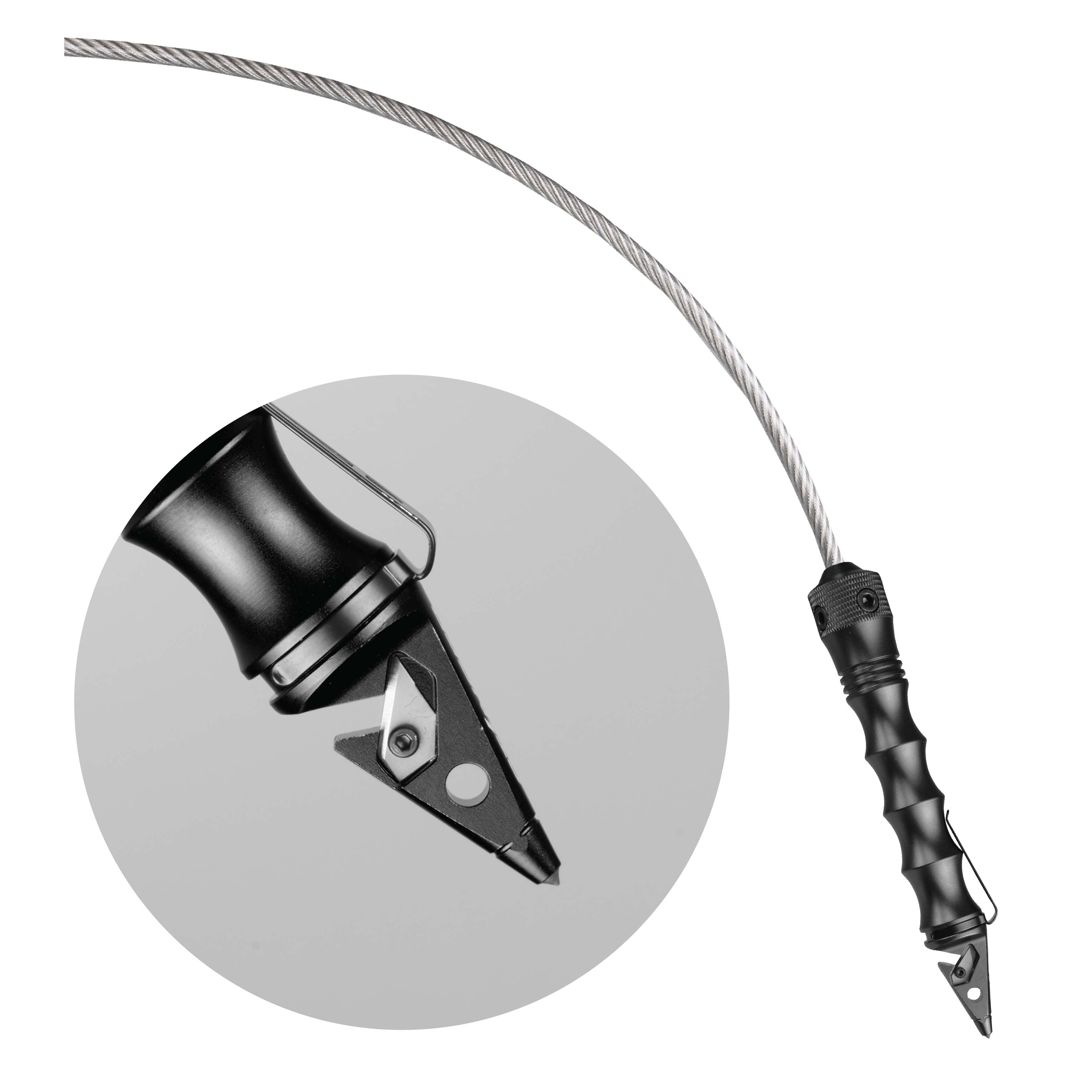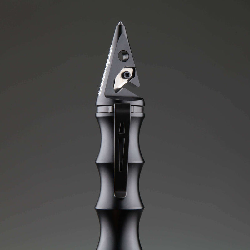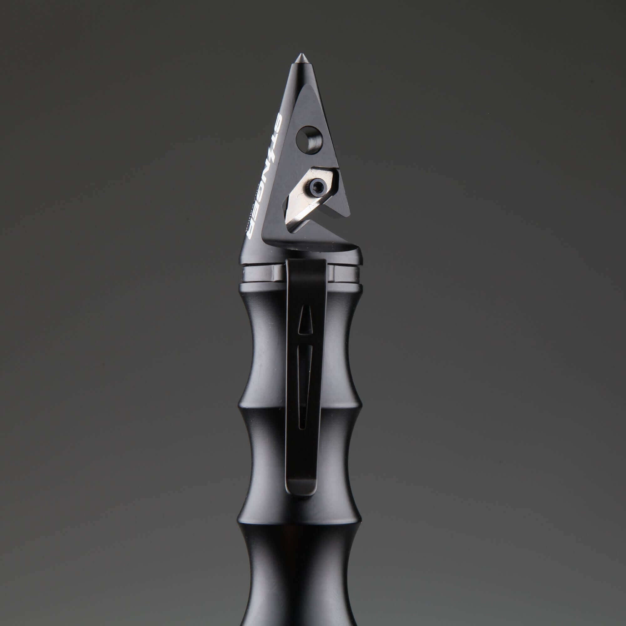 - The hardened steel tip on the handle is a window breaker designed to shatter tempered glass if a vehicle is entrapped.