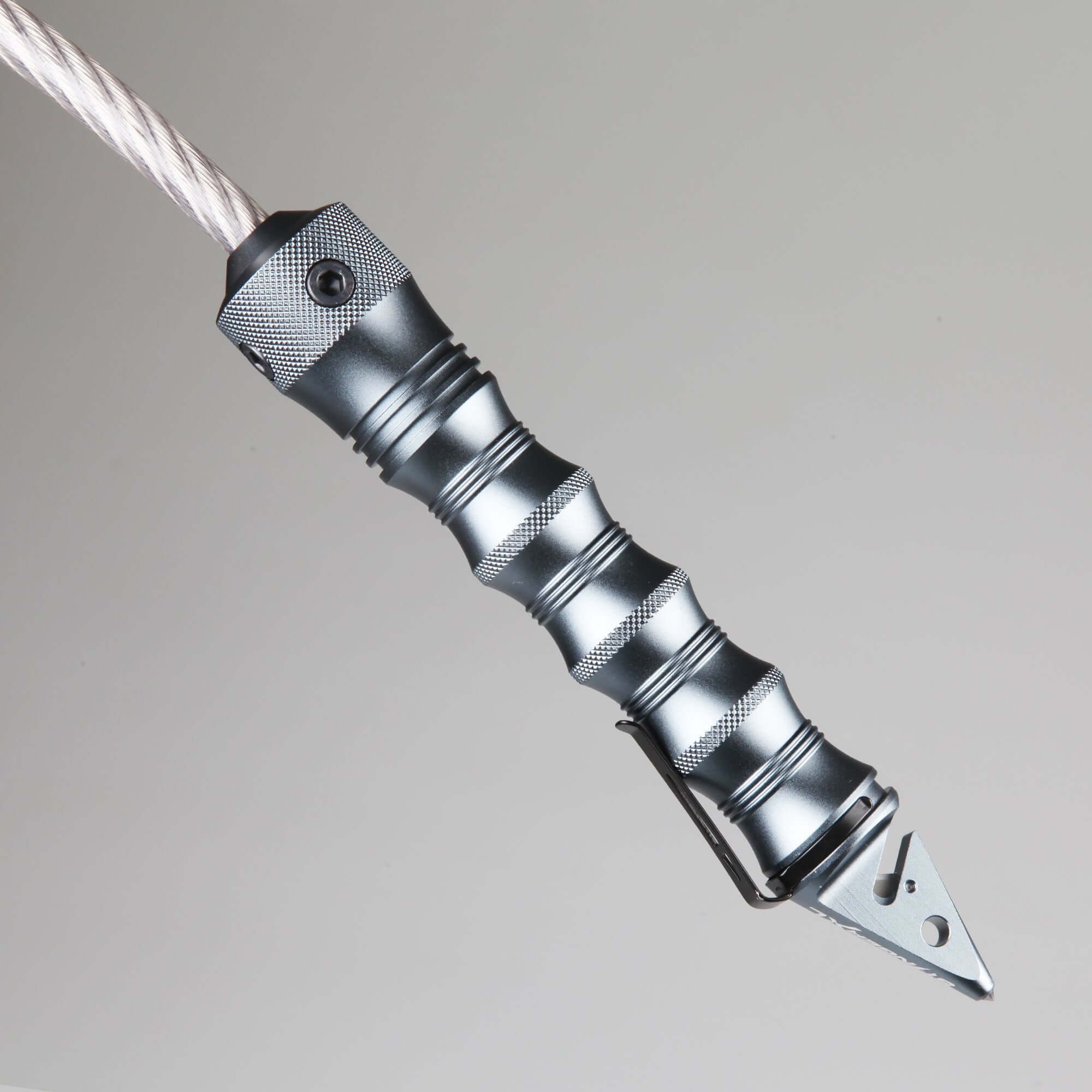 - The hardened steel tip on the handle is a window breaker designed to shatter tempered glass if a vehicle is entrapped.
