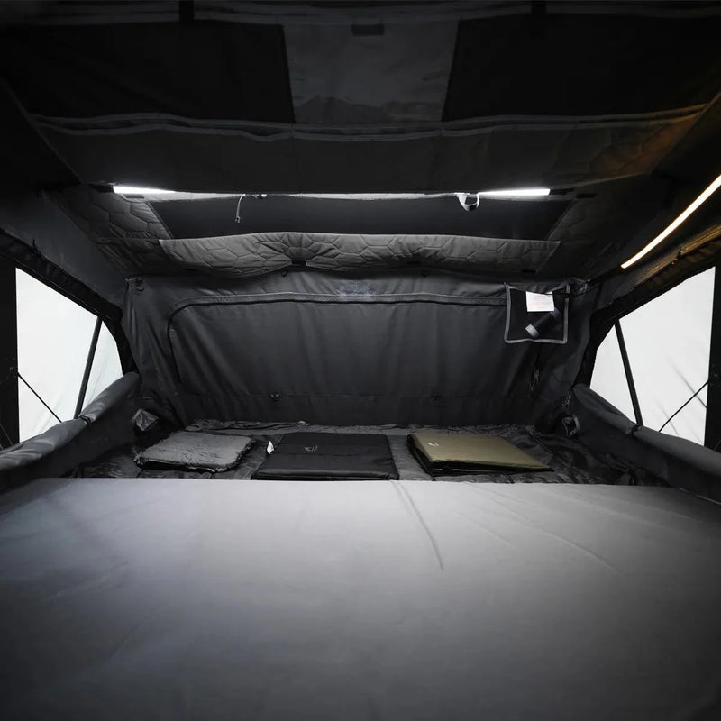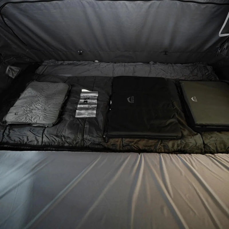 The Summit Explorer Max is an upgraded hard shell roof top tent with high front eaves, a lower back for better drainage, and a spacious interior for 3-4 people. It features a 360° panoramic view, a 10CM self-inflatable air mattress, a 3D anti-condensation mat, and includes a table, lounge, sleeping bag, air pump, and urine bag for a complete camping experience. With 1 door and 3 windows, it's perfect for any 4×4 vehicle.