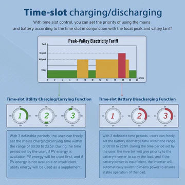 - Time-slot charging/discharging function: The SPH series 10000w inverter is equipped with a time-slot charging and discharging function, which allows users to set different charging and discharging periods according to the local peak and valley tariffs, so that the utility power and PV energy can be used rationally.