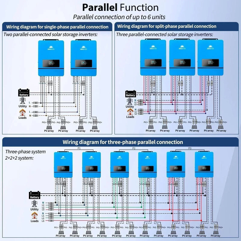 - Flexible Power Output: Parallel up to 6 units for a maximum power output of 48kw, supporting configurations of 120V single phase, 120V/240V split phase, or even 208V 3-phase. This adaptability ensures that you can scale your energy production as your needs grow.