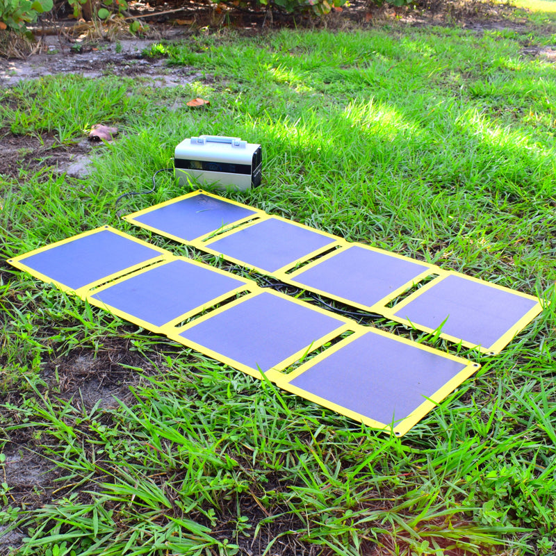 PARALLEL SOLAR PANEL CONNECTION: Connect two 60 watt solar panels to a single power supply for a combined maximum output of 120 watts. When connecting the two 60 watt solar panels using the included parallel adapter cable, the connection will combine the output current (amps) of each solar panel, but the output voltage will remain unchanged. For example, if connecting two solar panels that each produce 22 volts and 2.7 amps, the total combined output will equal 22 volts and 5.4 amps. Re-charge devices such as power stations or solar power generators much faster than when using only a single solar panel, or use the solar panels separately to charge multiple devices at the same time.