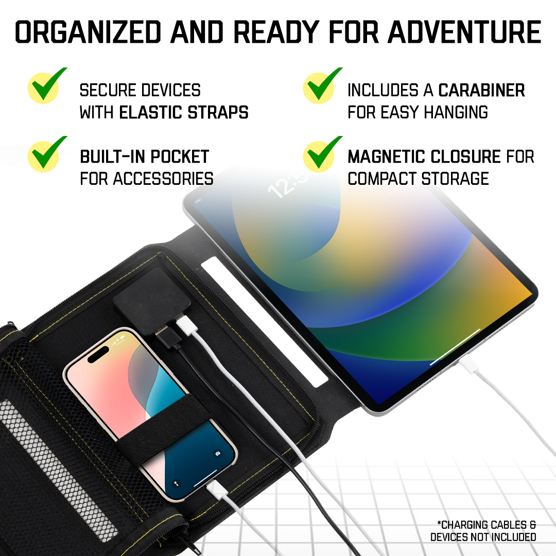COMPACT & PORTABLE: Panels fold down to the size of a tablet and easily fit into any backpack. Integrated magnetic closure system keeps the panels closed during storage, eliminating the need for bulky straps. Mesh pocket provides ample storage space for most electronics and accessories, while the elastic straps secure phones, power banks and more during storage and transport. The mesh design intuitively allows proper airflow to prevent devices from overheating while being charged.